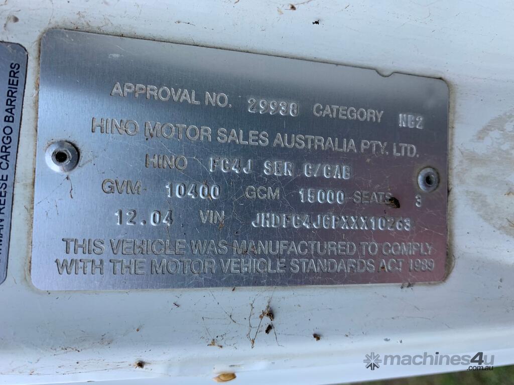 CP: 12/2004,Hino,FC4J,Chipper Tipper Day Cab,Manual,Spring,Engine #: J05CTJ10773,Hino J05C,4 Cyl,Diesel,6 Gears,399272 (Kms. Showing on Odometer),Hourmeter not visible,Colour: White,Unregistered,VIN: JHDFC4JGPXXX10263,Length: 3.6 M,GVM: 10400,GCM: 15000,Sold with No Plates
