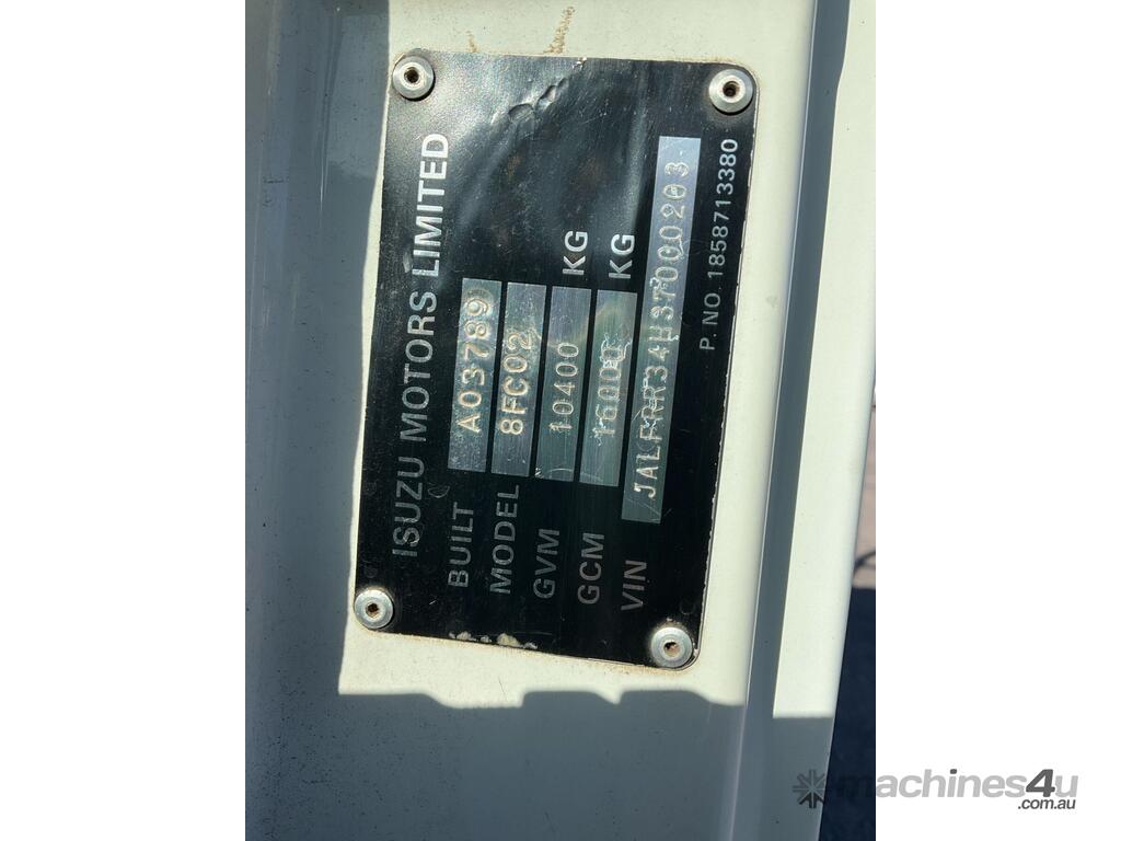 CP: 03/2004,Isuzu,FRR500,Diesel Fuel Tank,Manual,Spring,Engine #: 6HK1833590,6 Cyl,Diesel Turbo,6 Gears,463328 (Kms. Showing on Odometer),Hourmeter not visible,Colour: White,Unregistered,VIN: JALFRR34H37000203,Key No: 424E,Length: 7.5 undefined,GVM: 10400,GCM: 16000,Sold with No Plates,Key No: 424E
