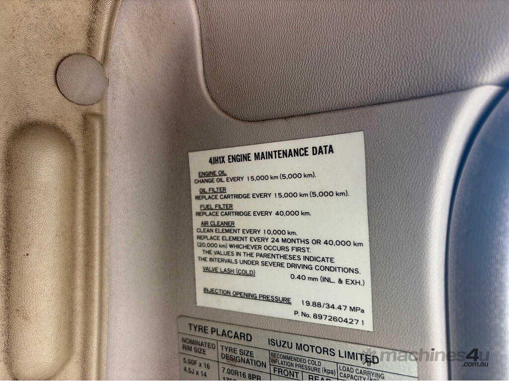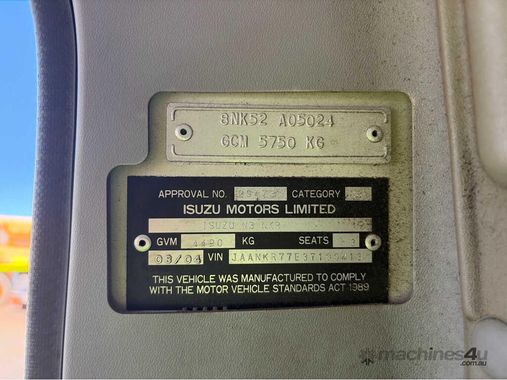 CP: 08/2004,Isuzu,N3 NKR,Table Top (Day Cab),Manual,4JH1X,4 Cyl,5 Gears,235206 (Kms. Showing on Odometer),Hourmeter not visible,Colour: White,Rego. No: 1DIL079 WA,VIN: JAANKR77E37100413,GVM: 4490,GCM: 5750,Sold with No Plates,WOVR Status: WOVR N/A,Incident Type: Impact