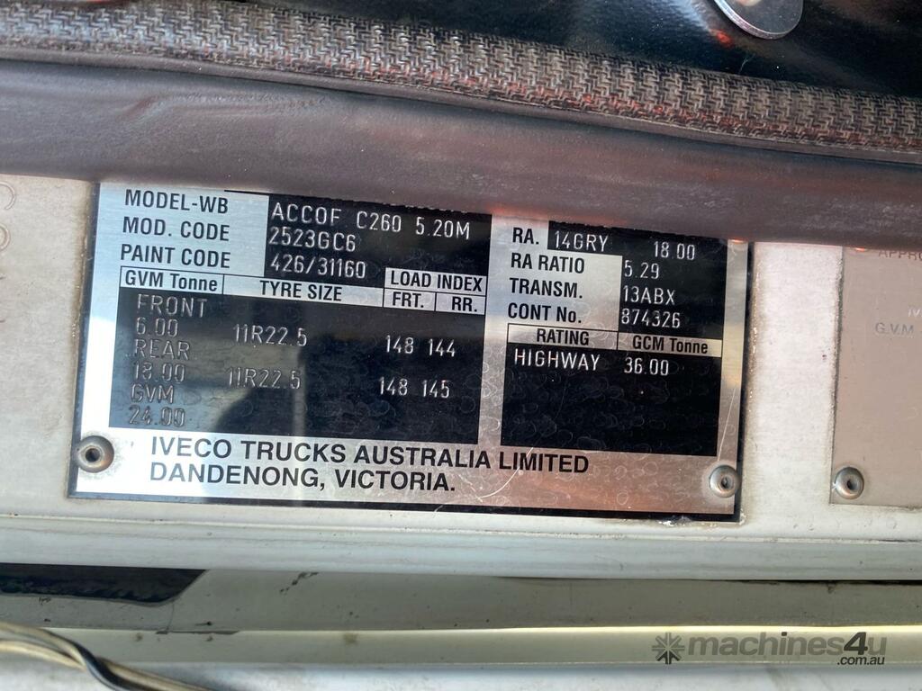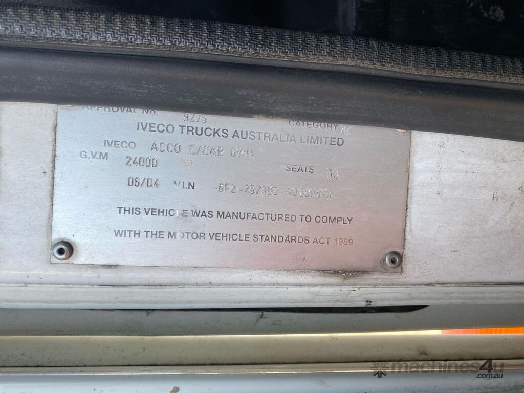 CP: 06/2004,Iveco,ACCO,Cab Chassis,Automatic,Airbag,6 Cyl,Diesel,Turbo,41672 (Kms. Showing on Odometer),2163 (Hrs. Showing on Hour meter),Colour: White,Rego. No: NP(XN21HD), Unregistered NSW,VIN: 6F22523004DL00575,Length: 17 ft,GVM: 24000,Sold with No Plates