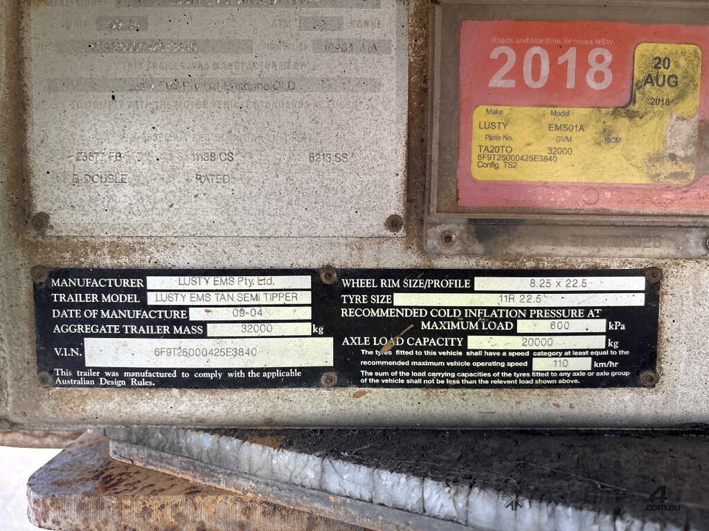 CP: 09/2004,Lusty EMS,Tan Semi Tipper,Tandem Axle Tipping Stag B Trailer,Hubometer not visible,Colour: White,Rego. No: NP(YN07QF), Unregistered NSW,VIN: 6F9T25000425E3840,Serial No: NULL,Sold with No Plates,WOVR Status: Statutory Write-Off,Incident Type: Impact