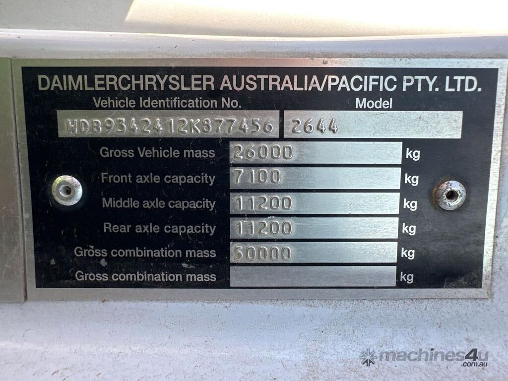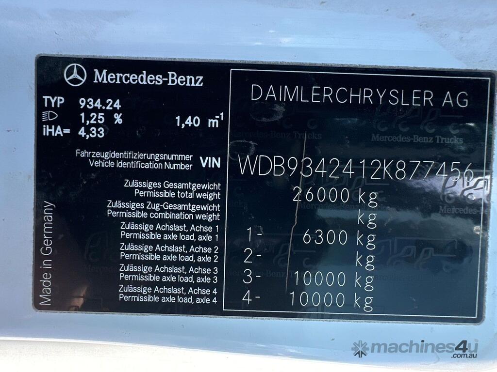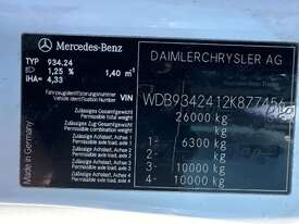 CP: 02/2004,Mercedes Benz,Actros 2644,Prime Mover,Automatic,Airbag,Mercedes Benz OM501 LA,6 Cyl,Diesel,Turbo,199756 (Kms. Showing on Odometer),Hourmeter not visible,Colour: White,Rego. No: NP(AB81BM), Unregistered NSW,VIN: WDB9342412K877456,Key No: 74,Length: 7 m,GVM: 26000,GCM: 50000,Sold with No Plates,Key No: 74