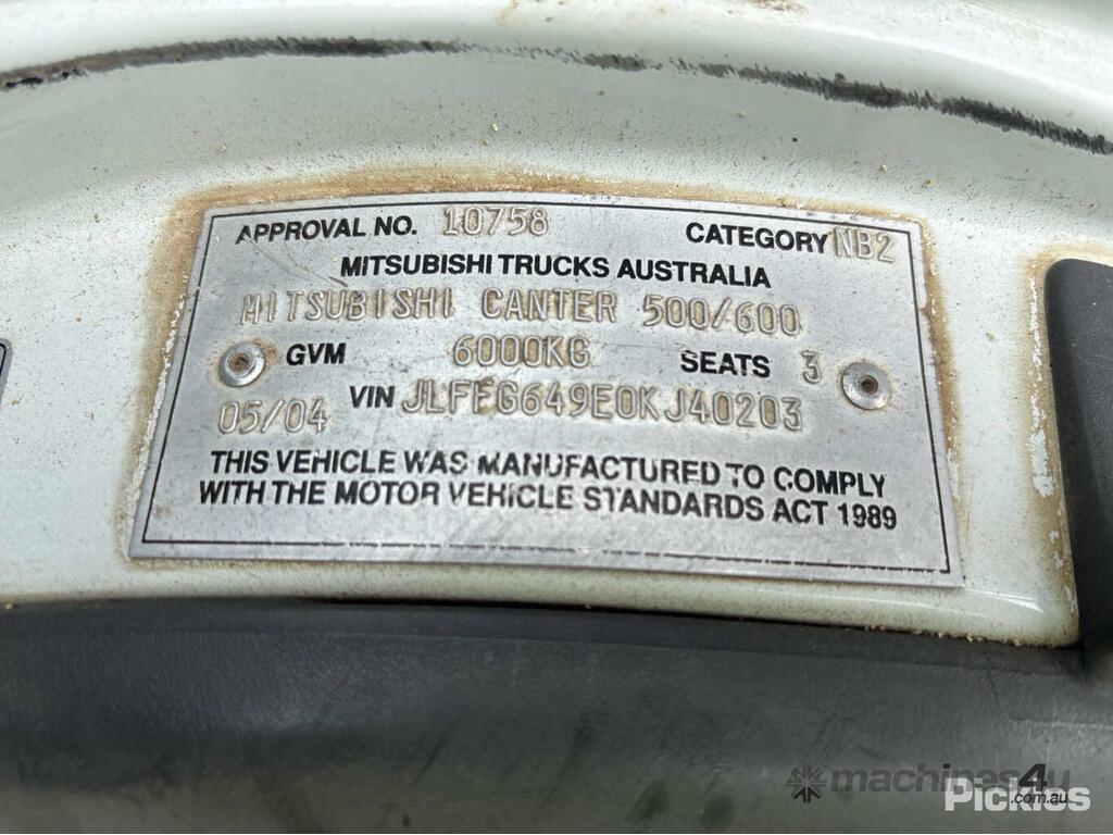CP: 05/2004,Mitsubishi,Canter 500/600,Boom Spray,Manual,Leaf Spring Suspension ,4 Cyl,Diesel Turbo,233890 (Kms. Showing on Odometer),Hourmeter not visible,Colour: White,Rego. No: NP(XT65CR), Unregistered,VIN: JLFFG649E0KJ40203,Length: 6.4 M,Sold with No Plates,WOVR Status: WOVR N/A,Incident Type: Impact