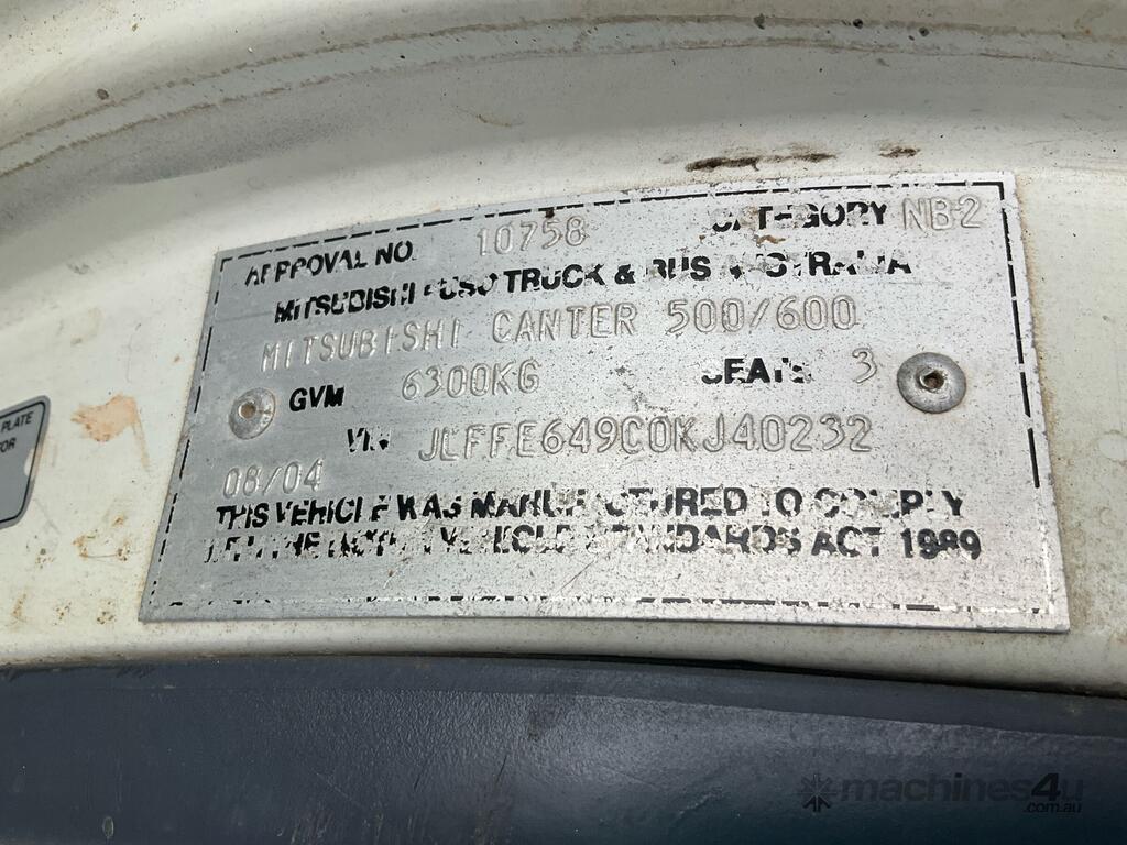 CP: 08/2004,Mitsubishi,Canter,Tipper,Manual,Leaf Spring Suspension,4 Cyl,Diesel,5 Gears,150158 (Kms. Showing on Odometer),Hourmeter not visible,Colour: White,Unregistered,VIN: JLFFE649C0KJ40232,Key No: 123,GVM: 6300,GCM: 9800,Sold with No Plates,Key No: 123