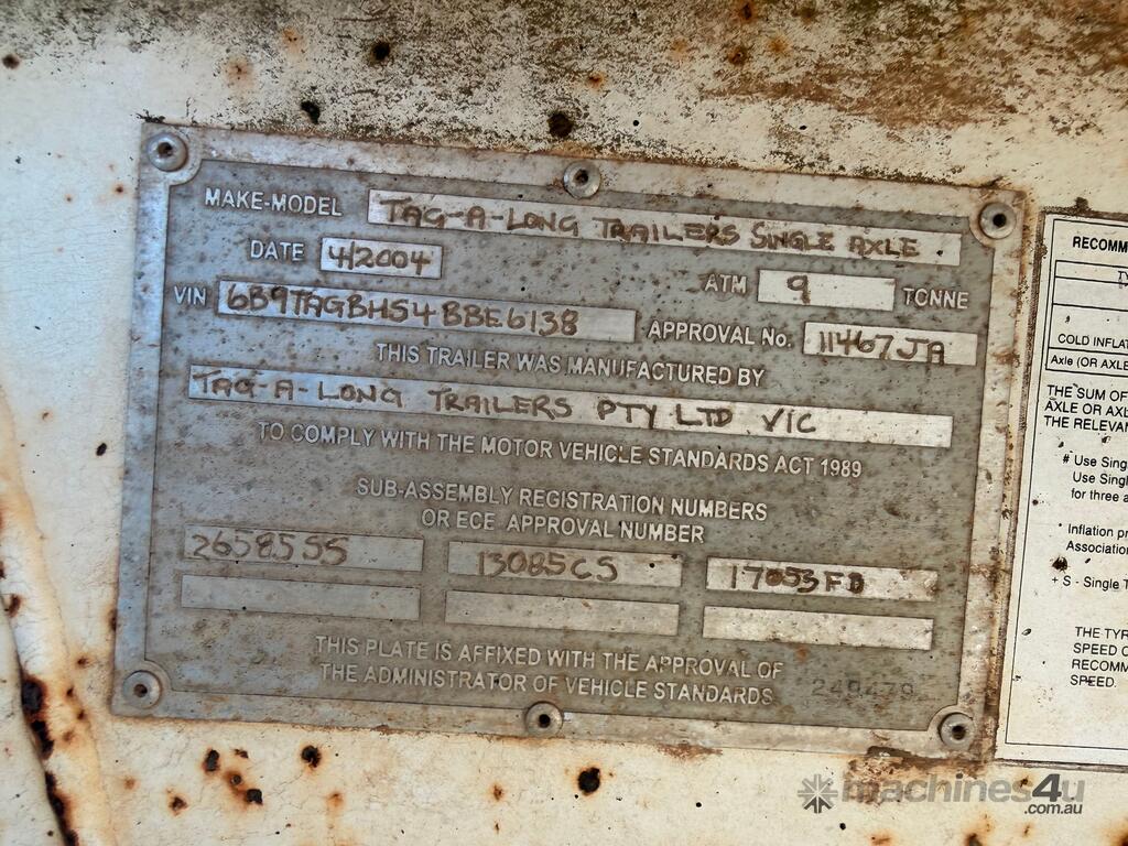 CP: 04/2004,Tag-a-Long Trailer,Single Axle Tag,Single Axle Plant Trailer,Hubometer not visible,Colour: White,Rego. No: Q18241 NSW,Rego expiry: 25/09/2026,VIN: 6B9TAGBHS4BBE6138,Sold with No Plates