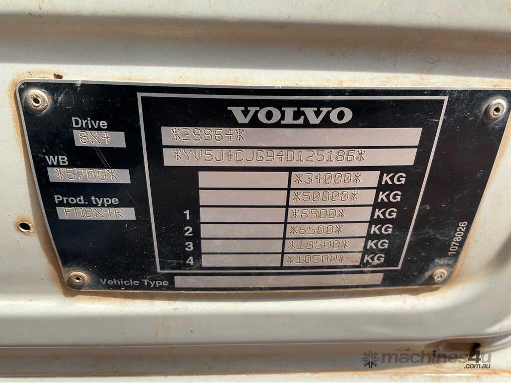 CP: 03/2004,Built: 03/2004,Volvo,FM9,Hook Truck,Manual,Rear Airbags Front Leaf ,Engine #: D9009725A2A,D9,9.4 Ltr,6 Cyl,Diesel Turbo,6 Gears,489432 (Kms. Showing on Odometer),Hourmeter not visible,Colour: White,Rego. No: NP(CE02FA), Unregistered NT,VIN: YV5J4CJG94D125186,Length: 9 m,GVM: 34000,GCM: 50000,Sold with No Plates