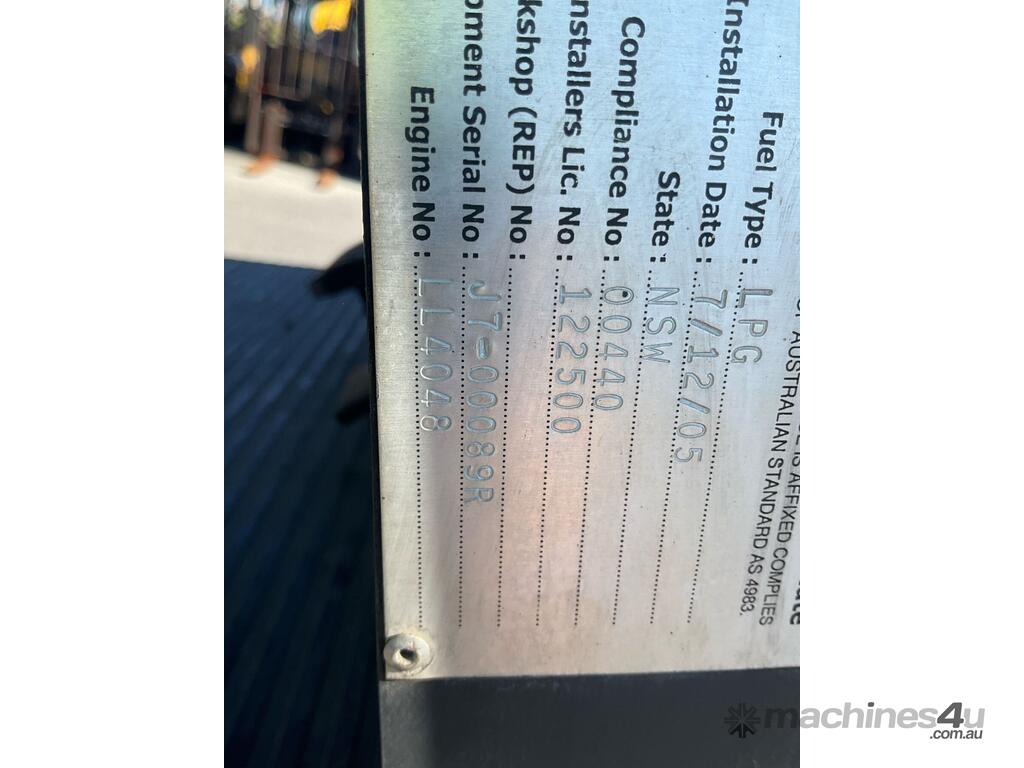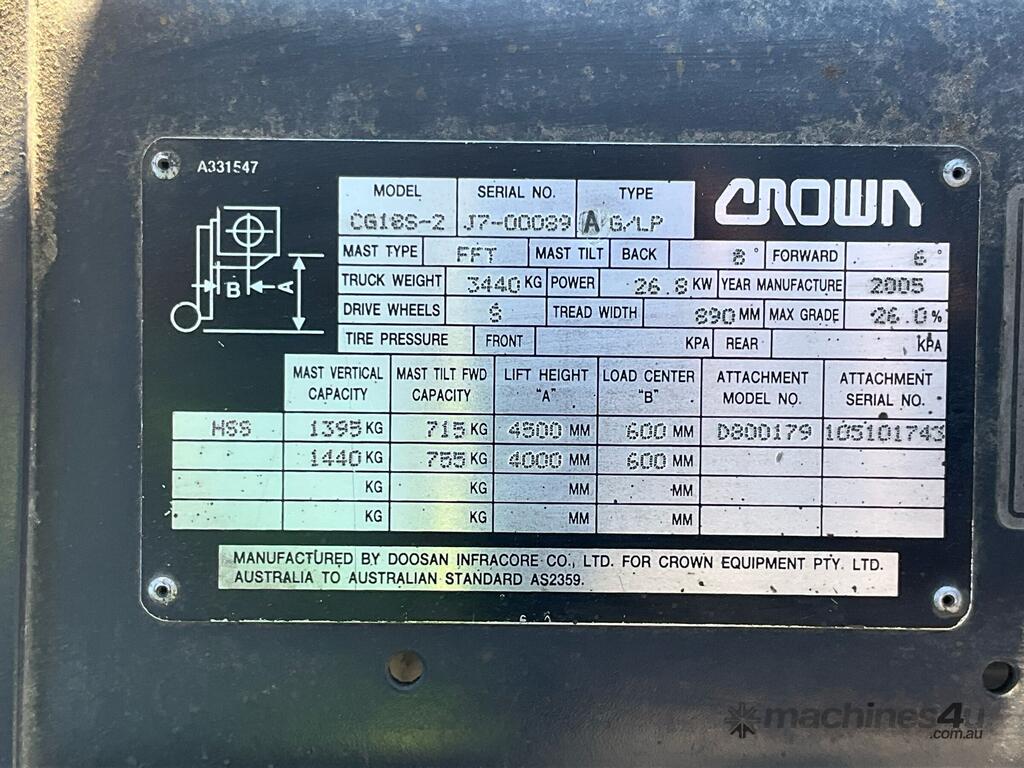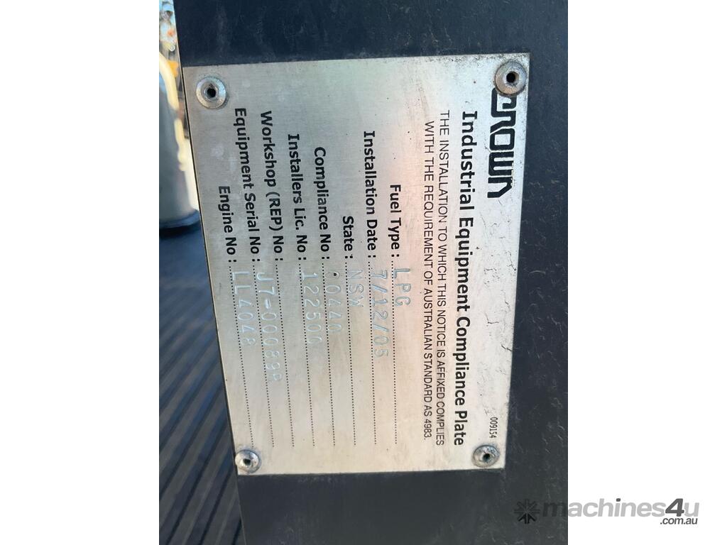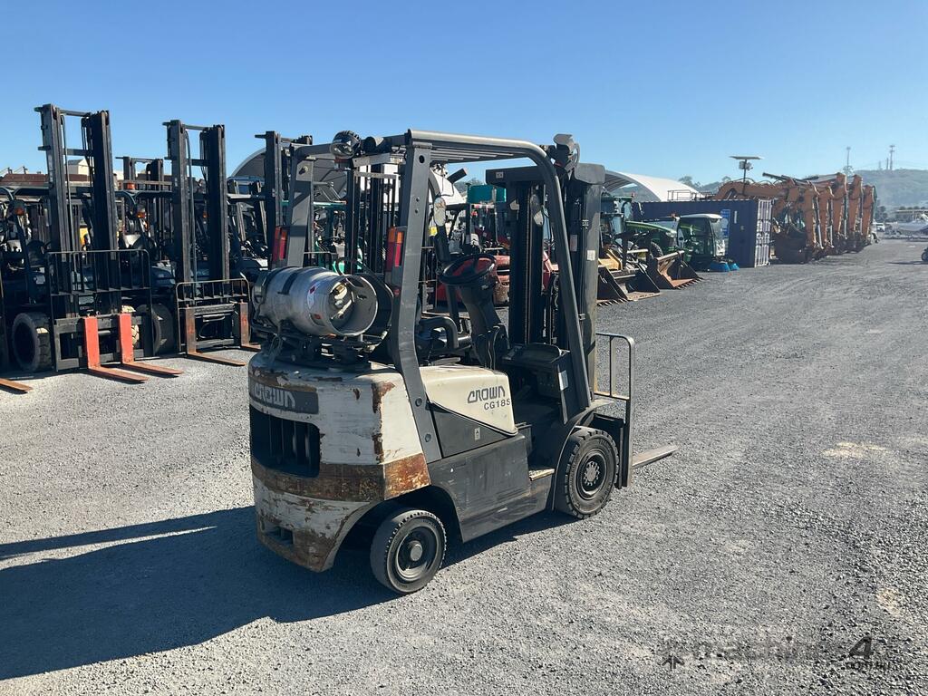 CP: CIRCA 2005,Crown,CG18S-2,Forklift (Container Mast),Engine #: LL4048,4 Cyl,Petrol & LPG (Dual),Odometer not visible,4754 (Hrs. Showing on Hour meter),Colour: Grey,Unregistered,Serial No: J700089,ROPS No: undefined,Sold with No Plates,Key No: 212E