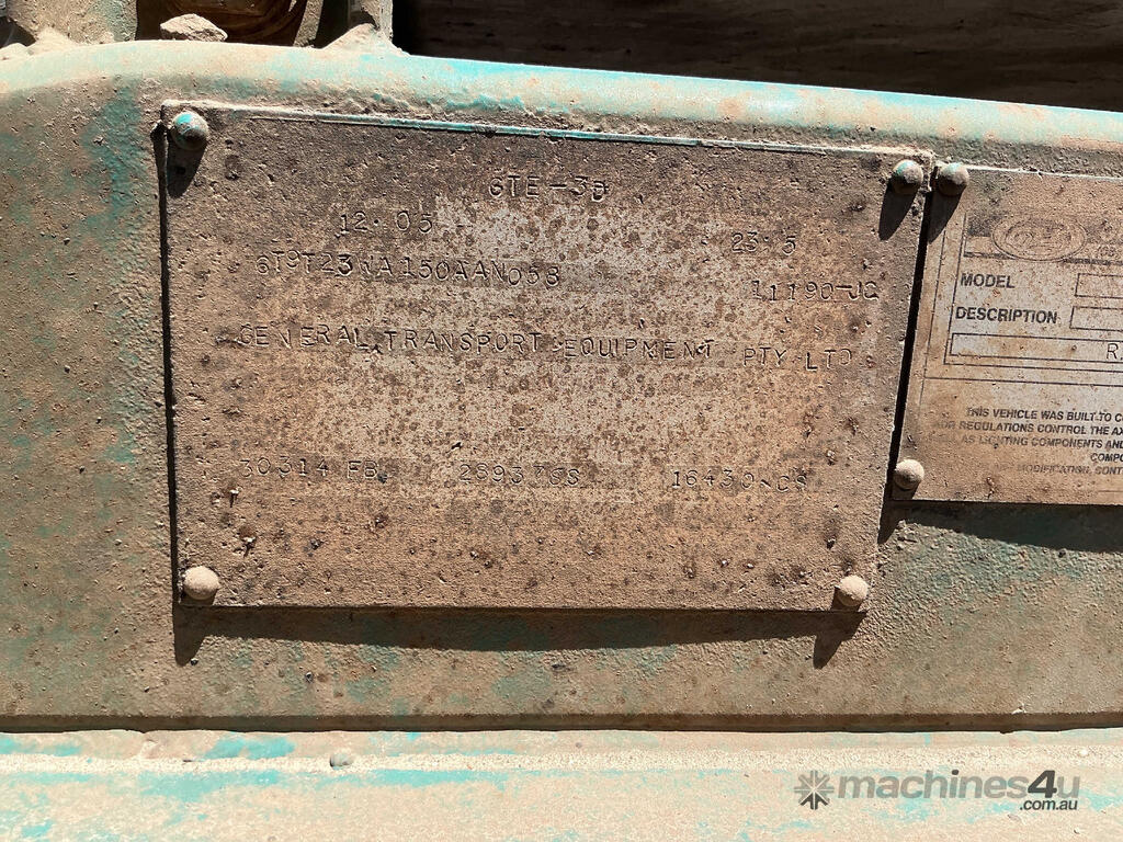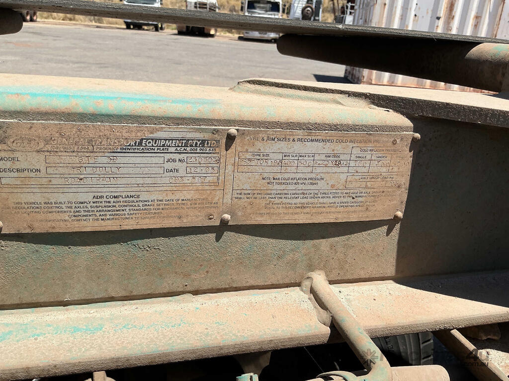 CP: 12/2005,General Transport Equipment,GTE 3D,Tri Axle Dolly,1599598 (Kms. Showing on Hubometer),Colour: Green,Rego. No: NP(1TGU842), Unregistered WA,VIN: 6T9T23WA150AAN058,Sold with No Plates