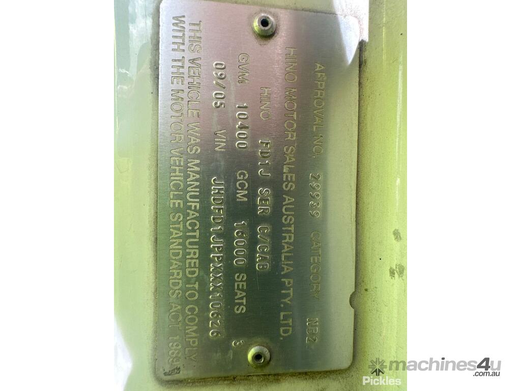 CP: 09/2005,Hino,FD 500,Tilt Tray,Manual,Leaf Spring ,Engine #: J08CUJ12802,Hino J08C,6 Cyl,Diesel,Turbo,6 Gears,673679 (Kms. Showing on Odometer),Hourmeter not visible,Colour: White,Rego. No: NP(XQ66VV), Unregistered ACT,VIN: JHDFD1JPPXXX10626,Key No: 43,Length: 10 m,GVM: 10400,GCM: 16000,Sold with No Plates,Key No: 43