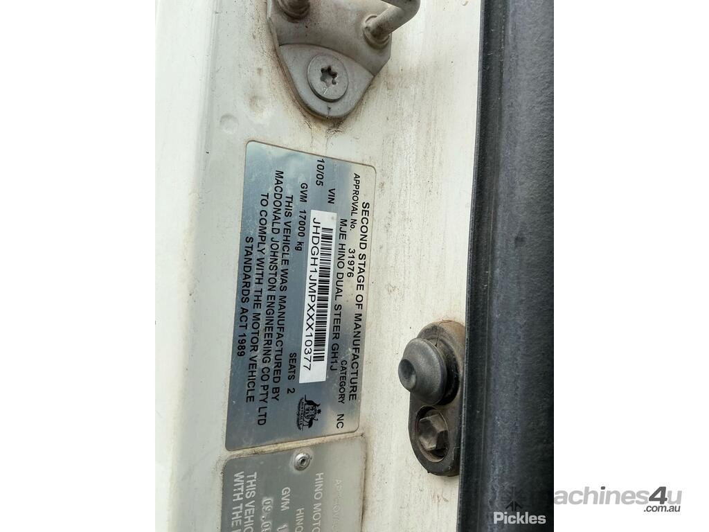 CP: 10/2005,Built: 10/2005,Hino,GH1J,Tipper Body,Automatic,6 Cyl,Diesel,Odometer not visible,Hourmeter not visible,Colour: White,Rego. No: NP(XV38CB), Unregistered VIC,VIN: JHDGH1JMPXXX10377,Length: 8 m,GVM: 17000,GCM: 16000,Sold with No Plates,WOVR Status: WOVR N/A,Incident Type: Not Applicable