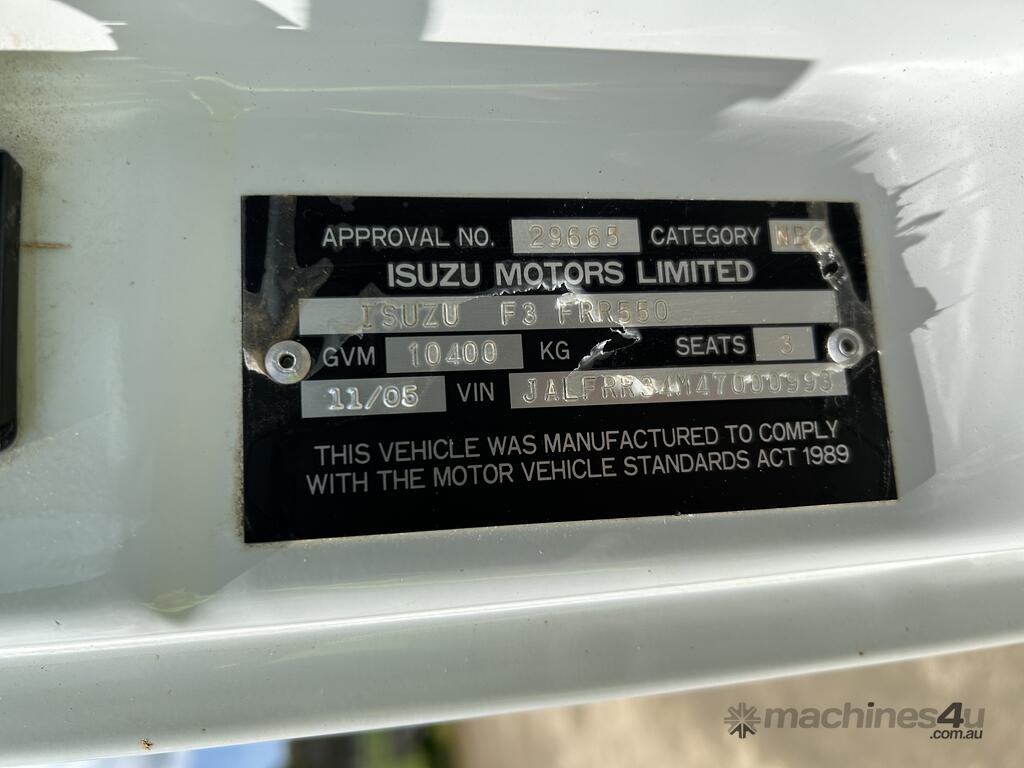 CP: 11/2005,Isuzu,FRR550 ,Curtainsider,Manual,Leaf Spring Suspension,Engine #: 6HKC,Isuzu 6HK1XS,6 Cyl,Diesel,6 Gears,115163 (Kms. Showing on Odometer),Hourmeter not visible,Colour: White,Rego. No: NP(TYV697), Unregistered VIC,VIN: JALFRR34M47000993,GVM: 10400,GCM: 16000,Sold with No Plates