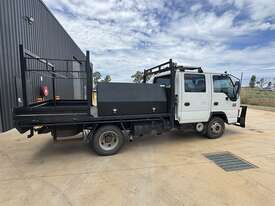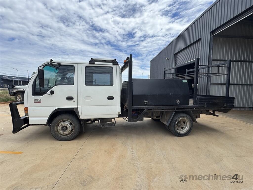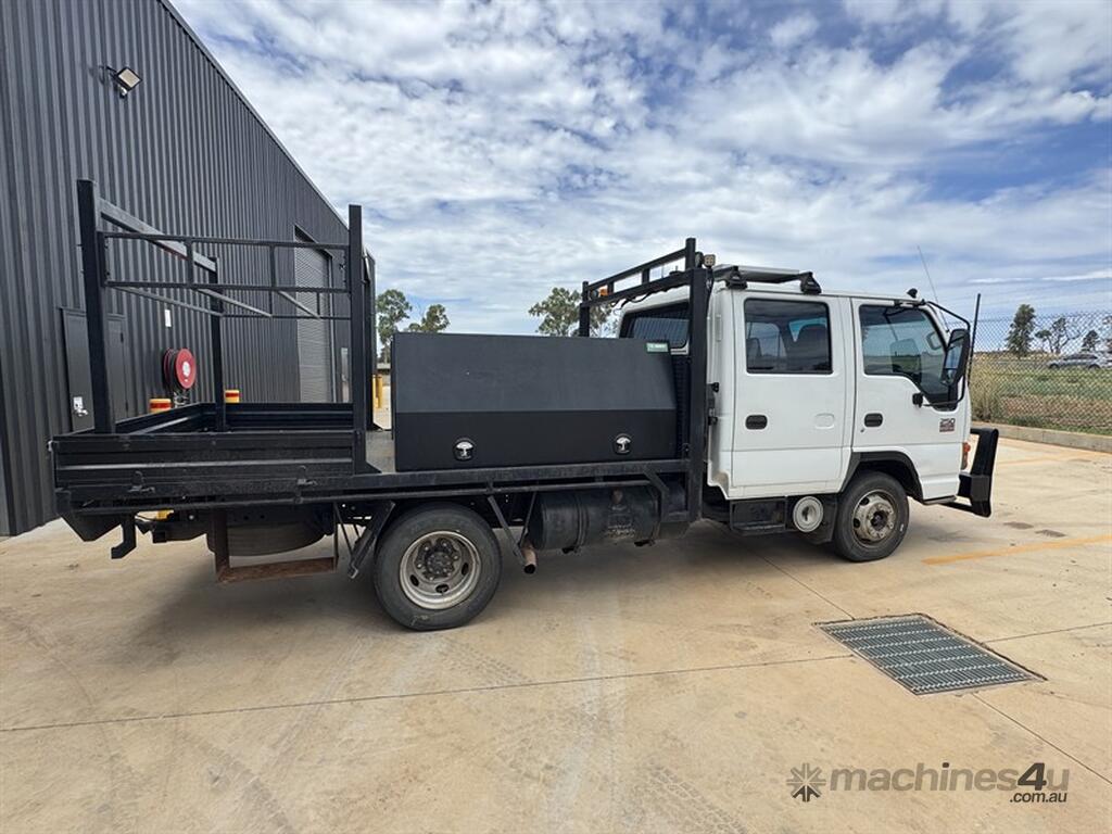 2005 Isuzu NPR 250 Crew (N5) table top work truck, VIN: JAANPR7OL37105913 Odometer: 319,646. 6-speed manual Dual rear wheels. Tare 3,580 kg, GVM 4,490 kg. Fitted with TC toolboxes, headboard tank, Redarc inverter with roof-mounted solar panel, 4-post bull bar with light bar, GME UHF, work lights and beacons. Tyres OK. Surplus to needs. Located Dubbo NSW Call Andrew