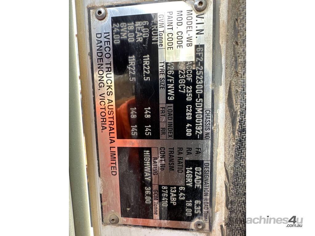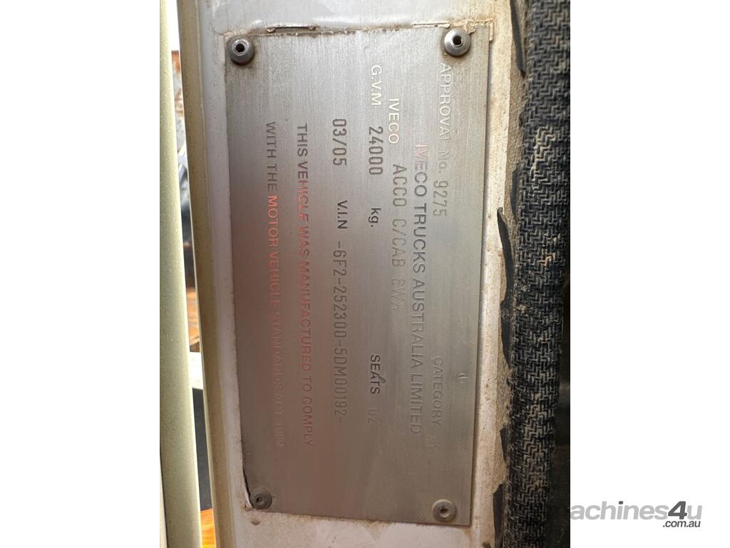 CP: 03/2005,Iveco,ACCO 2350G,Water Tanker,Automatic,6 Cyl,Diesel,Turbo,273994 (Kms. Showing on Odometer),25474 (Hrs. Showing on Hour meter),Colour: White,Rego. No: NP(XN27OB), Unregistered NSW,VIN: 6F22523005DM00192,Key No: IN ASSET,Length: 7.5 m,GVM: 24000,GCM: 36000,Sold with No Plates,WOVR Status: Statutory Write-Off,Incident Type: Fire,Key No: IN ASSET