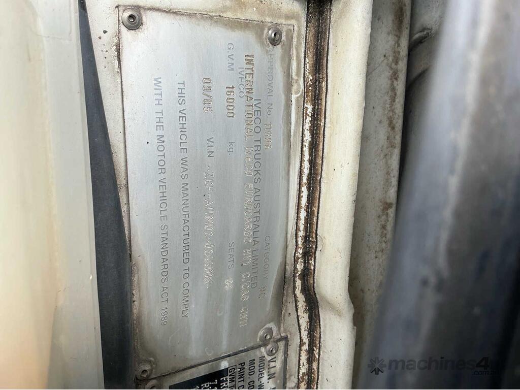 CP: 09/2005,Iveco,Eurocargo 180E28,Curtain Sider,Manual,Airbags ,6 Cyl,Diesel Turbo,8 Gears,577717 (Kms. Showing on Odometer),19649 (Hrs. Showing on Hour meter),Colour: White,Rego. No: XQ70SE QLD,Rego expiry: 11/07/2026,VIN: ZCFA1TM,Key No: 46E,Length: 11.7 m,GVM: 16000,GCM: 32500,Sold with No Plates,Key No: 46E