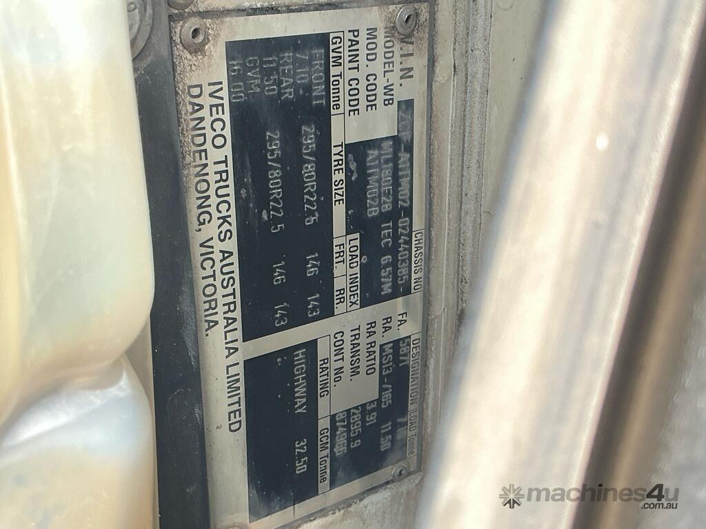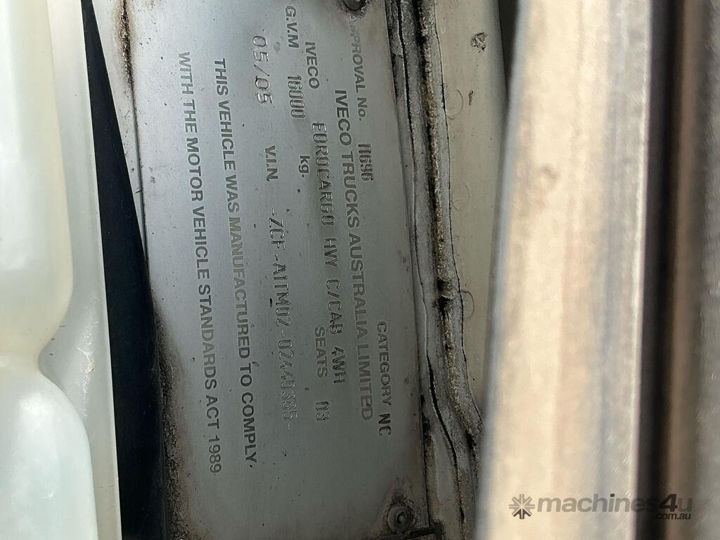 CP: 05/2005,Iveco,Eurocargo 180E28,Table Top,Manual,Air Suspension ,Odometer not visible,Hourmeter not visible,Colour: White,Unregistered WA,VIN: ZCFA1TM,Length: 33 ft,GVM: 16000,GCM: 32500,Sold with No Plates,WOVR Status: WOVR N/A,Incident Type: Not Applicable