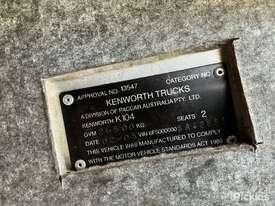 CP: 02/2005,Kenworth,K104,Prime Mover,Automatic,Diesel,Odometer not visible,Hourmeter not visible,Colour: White,Rego. No: NP(XW86UP), Unregistered VIC,VIN: 6F50000005A428526,Length: 21 ft,GVM: 26500,Sold with No Plates,WOVR Status: WOVR N/A,Incident Type: Malicious