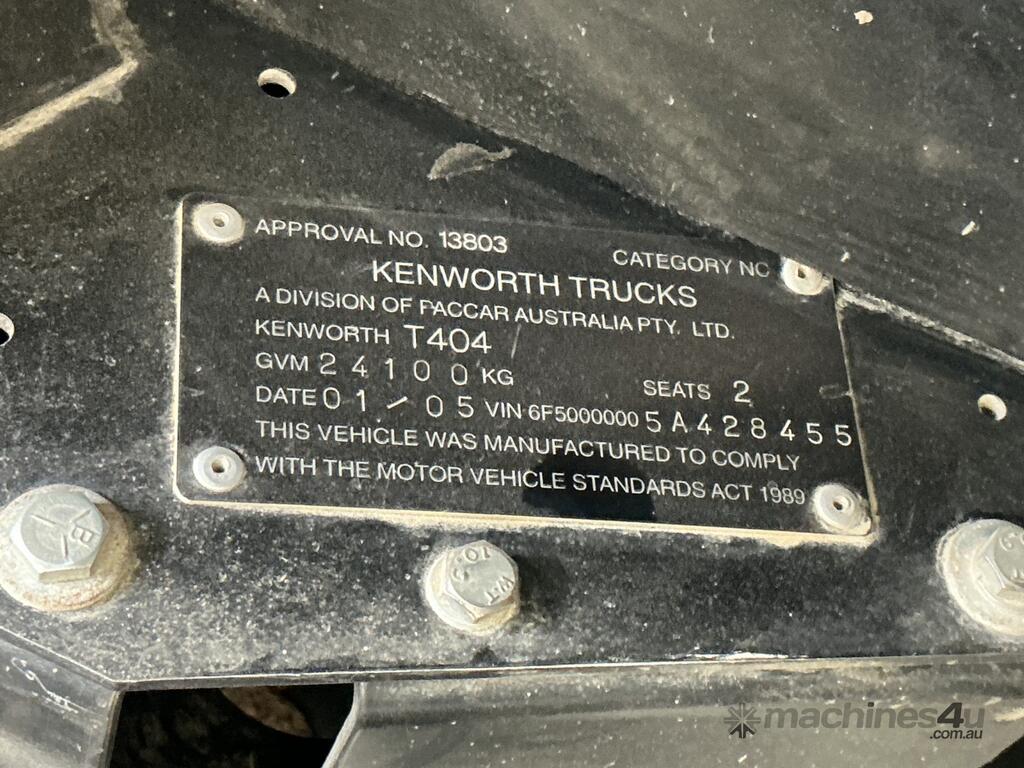 CP: 01/2005,Kenworth,T404,Tipper,Manual,Airbag Suspension,Cummins,6 Cyl,Diesel,10689 (Kms. Showing on Odometer),Hourmeter not visible,Colour: Black,Rego. No: XP59DD,VIN: 6F50000005A428455,Chassis: 6F5000005A428455,GVM: 24100,GCM: 70000,Sold with No Plates