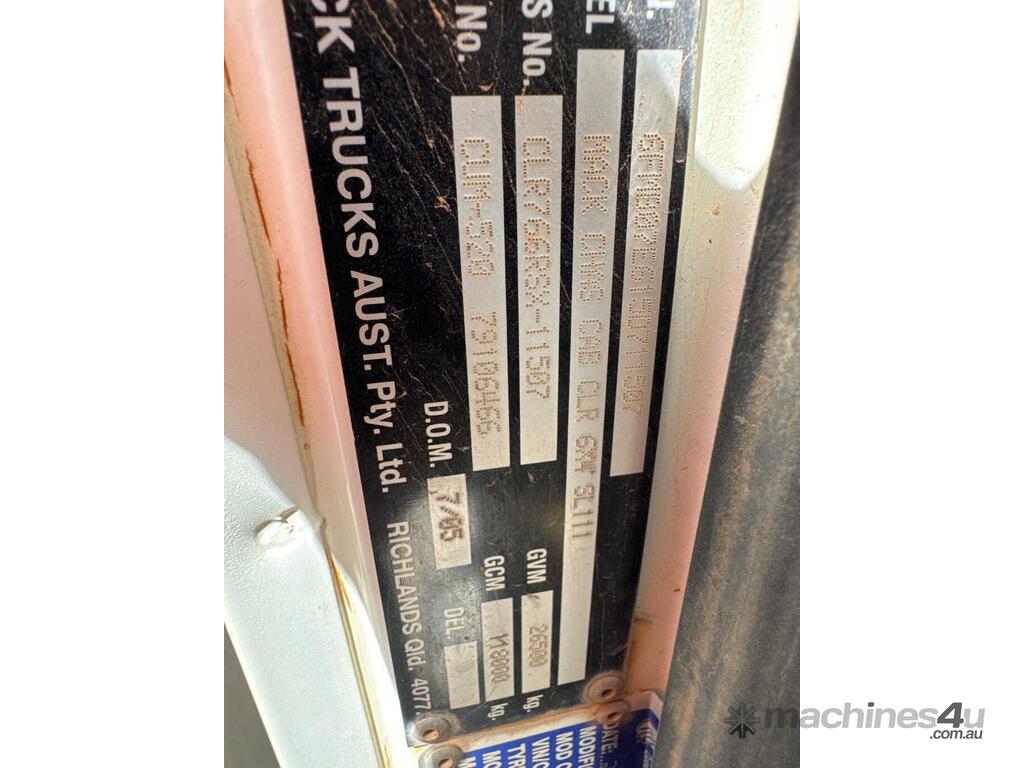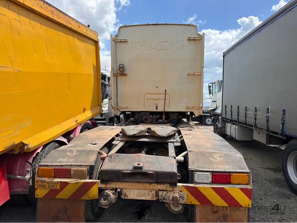 CP: CIRCA 2005,Mack,Titan,6x4 Sleeper Cab Prime Mover,Manual,spring,6 Cyl,Diesel,Odometer not visible,Hourmeter not visible,Colour: White,Rego. No: NP(XQ81IE), Unregistered QLD,VIN: 6FMB07E,Length: 8 m,GVM: 26500,GCM: 118000,Sold with No Plates,WOVR Status: WOVR N/A,Incident Type: Water