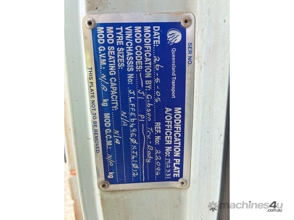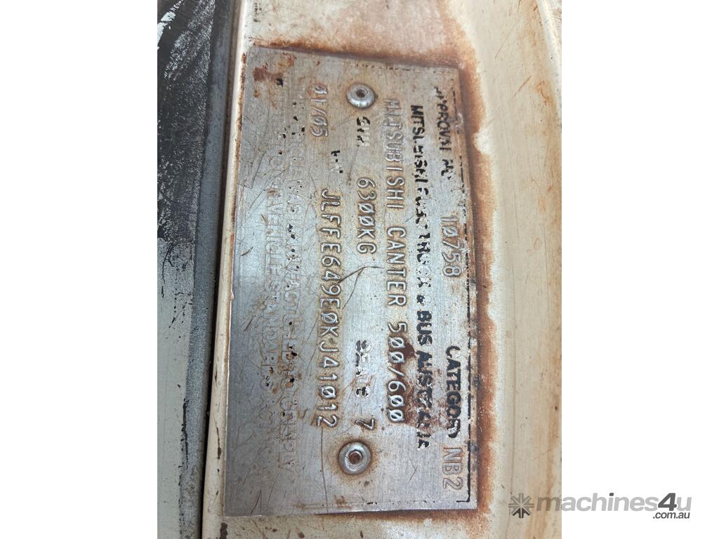 CP: 01/2005,Mitsubishi,500/600 Canter,Dual Cab Tipper,Manual,Mitsubishi ,4 Cyl,Diesel,268602 (Kms. Showing on Odometer),Hourmeter not visible,Unregistered,VIN: JLFFE649E0KJ41012,GVM: 6300,GCM: 9800,Sold with No Plates