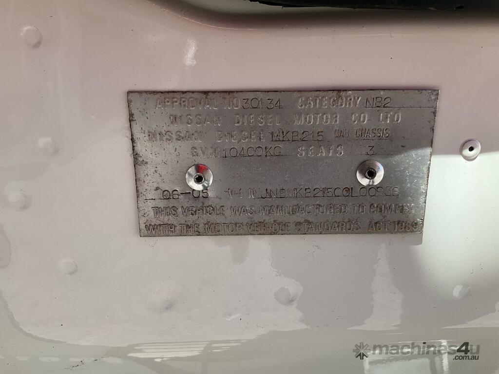 CP: 06/2005,Nissan UD,MK245,Cab Chassis Day Cab,Manual,Spring,Engine #: FE6303131F,6 Cyl,Diesel Turbo,6 Gears,505873 (Kms. Showing on Odometer),Hourmeter not visible,Colour: White,Rego. No: NP(TZW601), Unregistered,VIN: JNBMKB21500L00936,Key No: 346E,Length: 10 m,GVM: 10400,Sold with No Plates,Key No: 346E