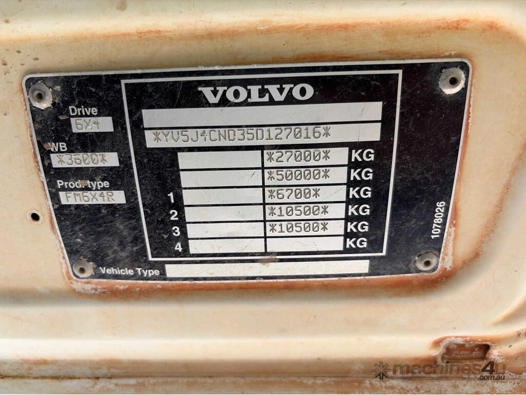 CP: 07/2005,Volvo,Fm,Cab Chassis,Automatic,Trunnion,6 Cyl,Diesel Turbo,114080 (Kms. Showing on Odometer),4010 (Hrs. Showing on Hour meter),Colour: White,Rego. No: NP(XN53ZV), Unregistered NAT,VIN: YV5J4CND35D127016,Key No: 338,Length: 9100 m,GVM: 27000,GCM: 50000,Sold with No Plates,WOVR Status: WOVR N/A,Incident Type: Not Applicable,Key No: 338