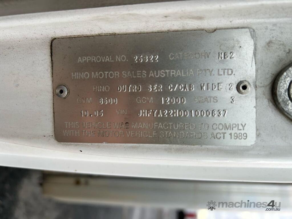 CP: 10/2006,Hino,DUTRO,Refrigerated Pantech,Manual,Spring,4 Cyl,Diesel,5 Gears,585589 (Kms. Showing on Odometer),Hourmeter not visible,Colour: White,Rego. No: NP(XQ48JU), Unregistered NAT,VIN: JHFYA22H,Key No: 272,GVM: 8500,GCM: 12000,Sold with No Plates,Key No: 272