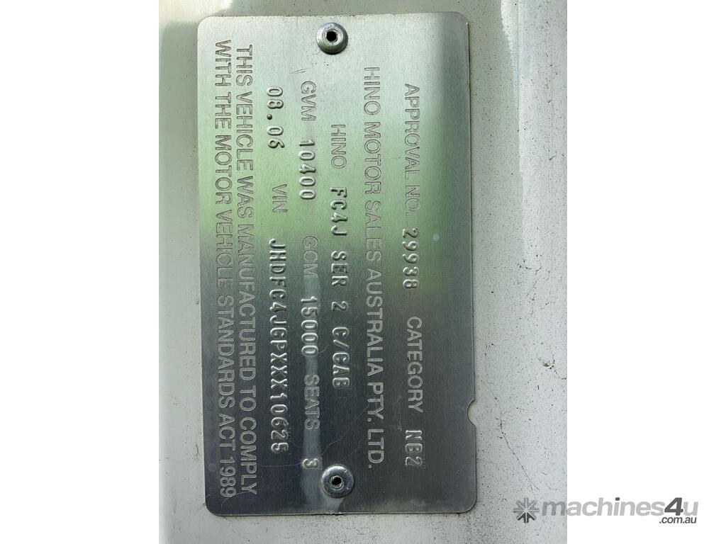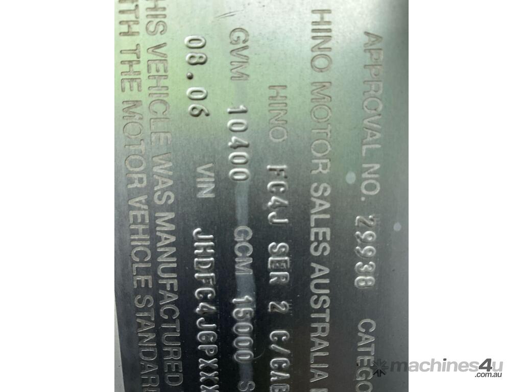 CP: 08/2006,Hino,FC4J,Crane Tipper,Manual,Spring,Engine #: J05CTJ11688,4 Cyl,Diesel Turbo,6 Gears,232019 (Kms. Showing on Odometer),Hourmeter not visible,Colour: White,Rego. No: NP(XO58DJ), Unregistered NSW,VIN: JHDFC4JGPXXX10625,Key No: 423E,Length: 6.7 undefined,GVM: 10400,GCM: 15000,Sold with No Plates,Key No: 423E