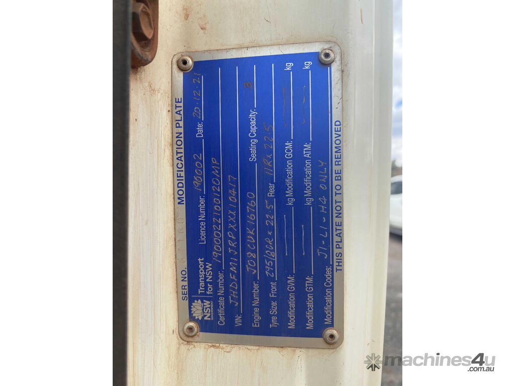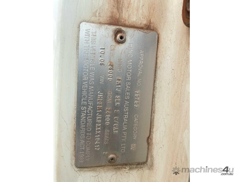 CP: 10/2006,Hino,FM1J,Water Cart,Automatic,351628 (Kms. Showing on Odometer),Hourmeter not visible,Colour: White,Rego. No: CE68TQ NT,VIN: JHDFH1JRPXXX10417,Length: 9.9 M,GVM: 26000,GCM: 26000,Sold with No Plates