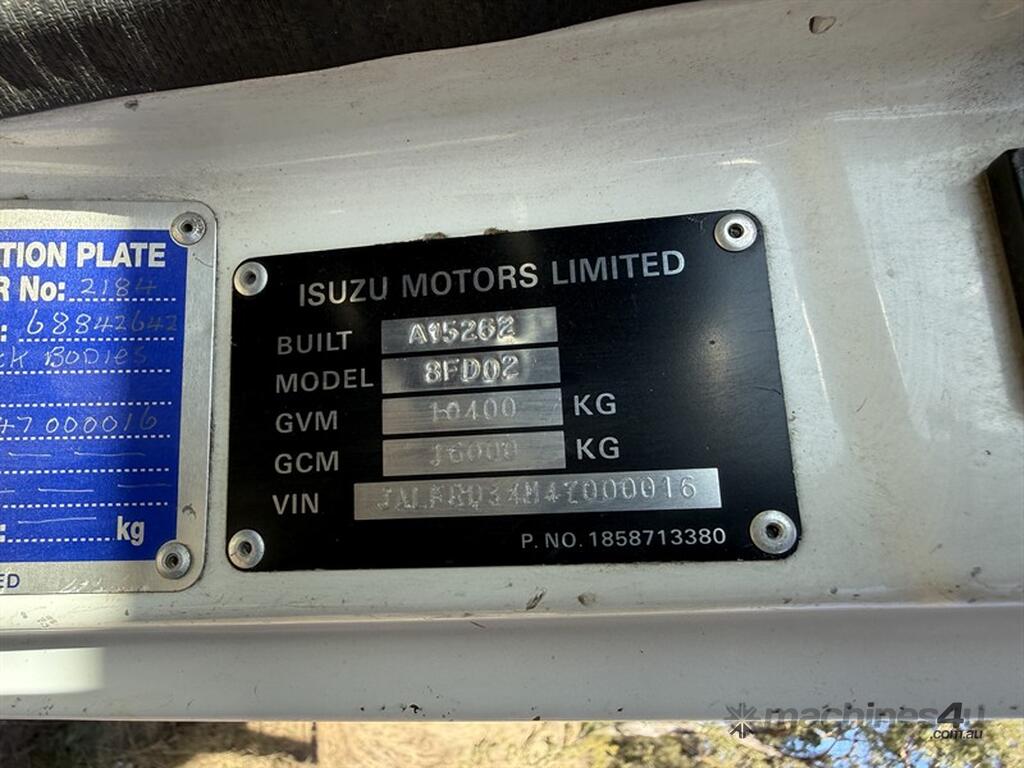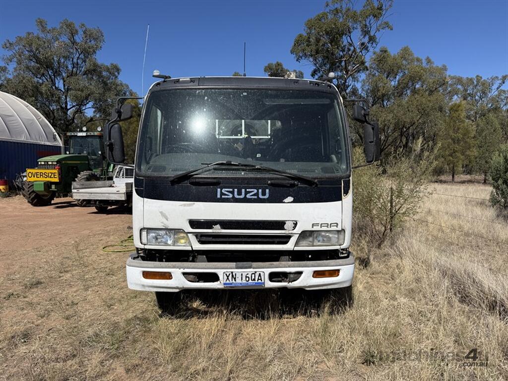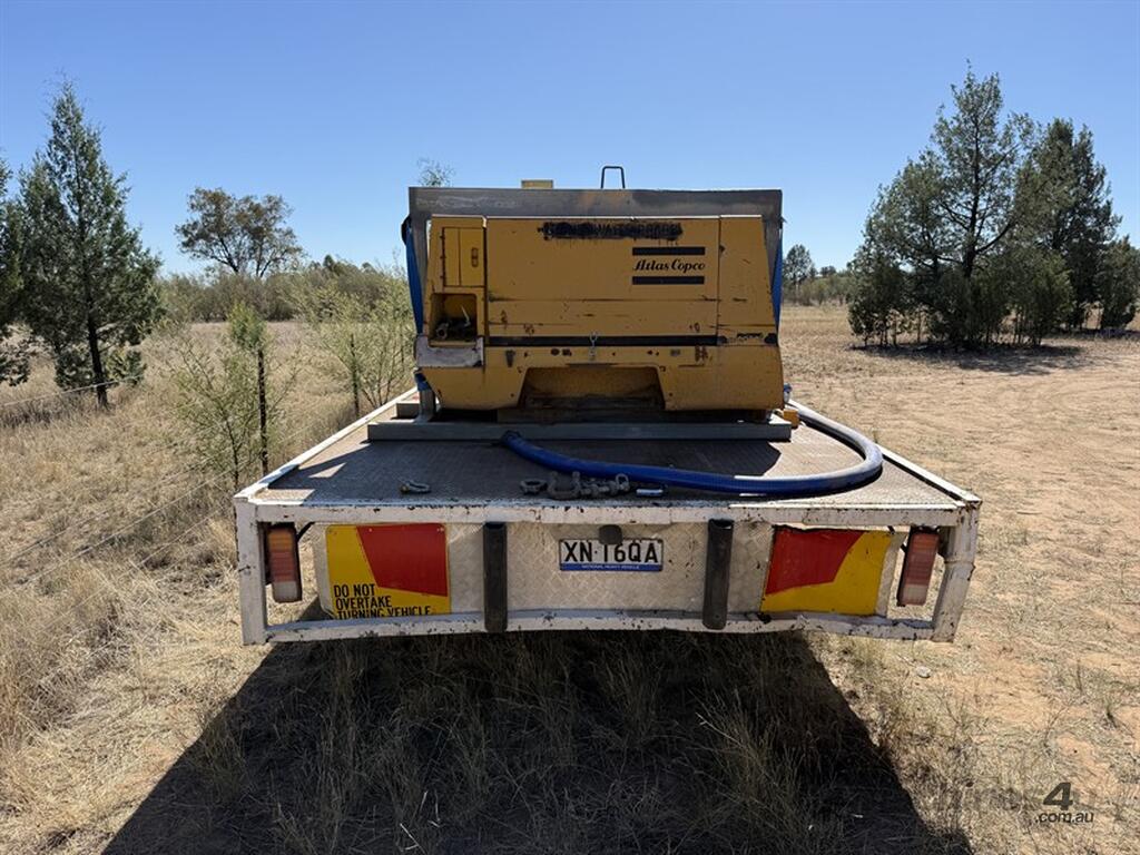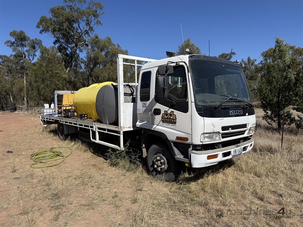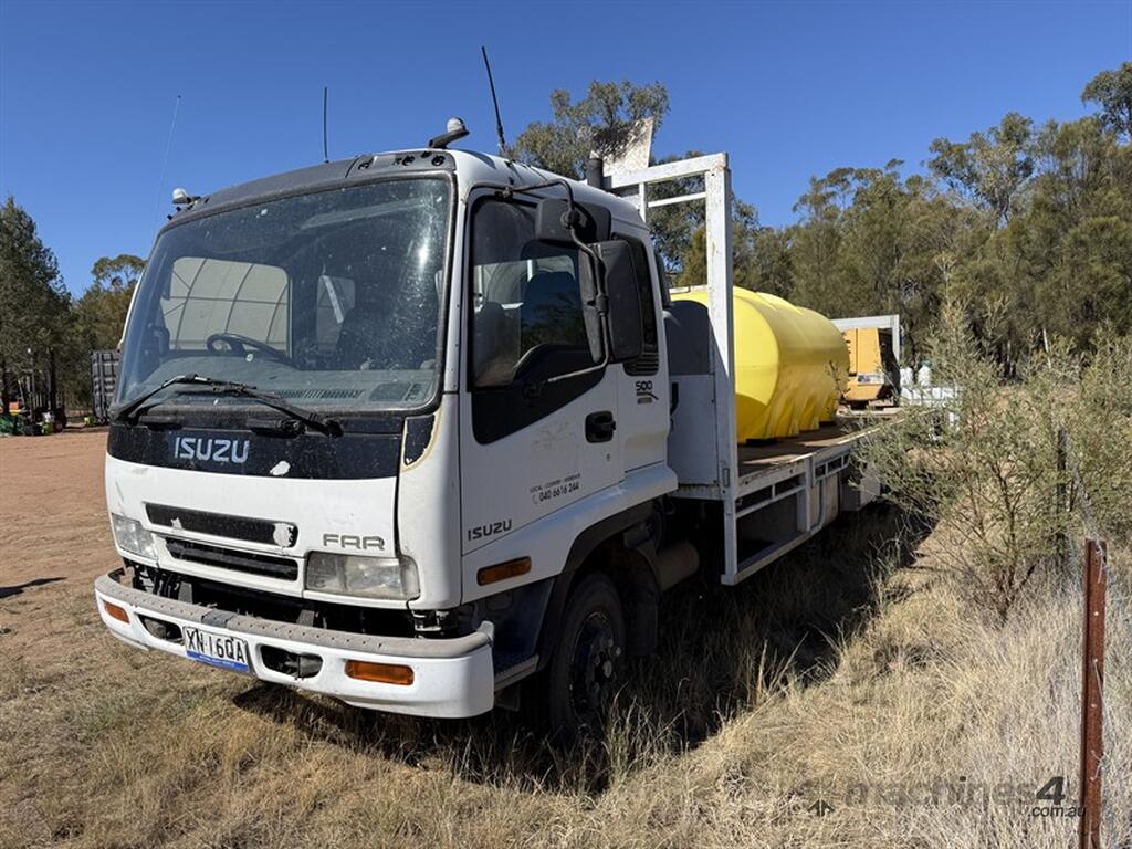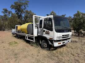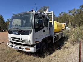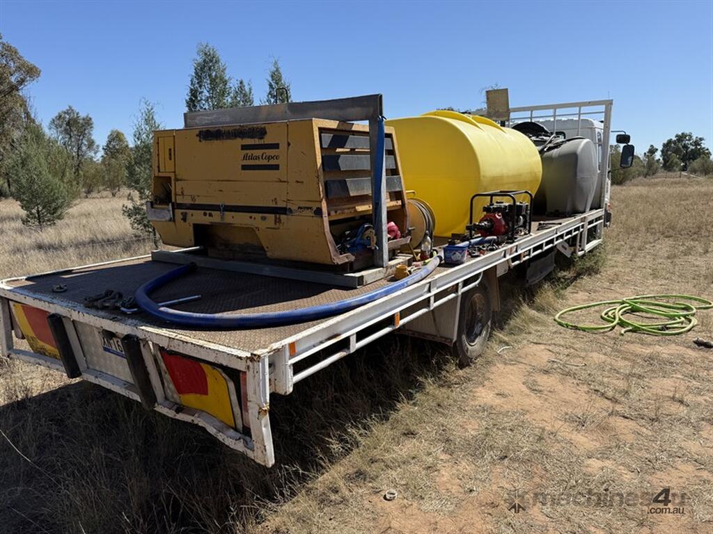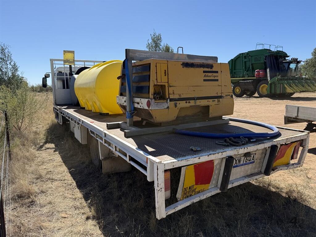 2006 ISUZU F3 FRD500 Truck. 10.4t GVM, 5.5t Tare. Steel tray - 7,750mm long, 2500mm wide, manual truck, 836,294kms, Atlas Copco XAS 60DD (approx 124CFM), approx 4750L water tank, 2,000L disel tank with electric pump. Selling due to business finishing up. Located Narrabri NSW, available at MRE Auctions online sale.