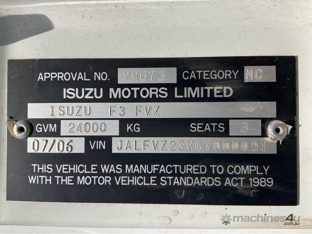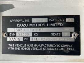 CP: 07/2006,Isuzu,FVZ1400 LWB,Beaver Tail,Manual,Spring ,6 Cyl,Diesel Turbo,211305 (Kms. Showing on Odometer),Hourmeter not visible,Colour: White,Rego. No: AL05VG NSW,Rego expiry: 11/09/2026,VIN: JALFVZ23V67000091,Key No: 23E,Length: 11.2 m,GVM: 24000,GCM: 36000,Plates to All,Key No: 23E