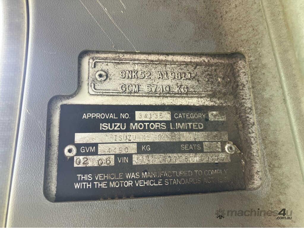 CP: 02/2006,Isuzu,NKR200,Table Top,Manual,Spring,4 Cyl,Diesel,Odometer not visible,Hourmeter not visible,Colour: White,Rego. No: NP(656MRW), Unregistered QLD,VIN: JAANKR77E57100175,GVM: 4450,GCM: 5740,Sold with No Plates,WOVR Status: WOVR N/A,Incident Type: Impact