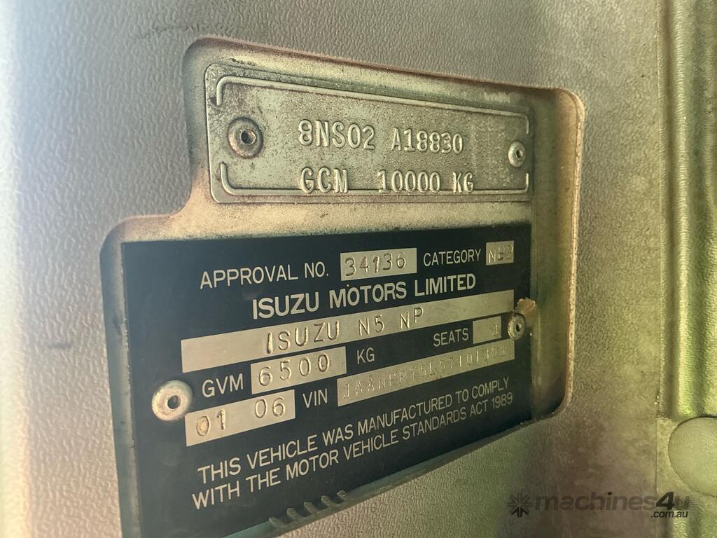 CP: 01/2006,Isuzu,NPR 300 Premium,Table Top (Day Cab),Automatic,Leaf Spring Suspension,4 Cyl,Diesel,553827 (Kms. Showing on Odometer),13367 (Hrs. Showing on Hour meter),Colour: White,Rego. No: NP(UZL801), Unregistered,VIN: JAANPR75L57101353,Key No: 116,GVM: 6500,GCM: 10000,Sold with No Plates,Key No: 116