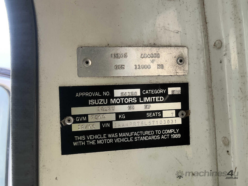 CP: 12/2006,Isuzu,NPR,Crew Cab Table Top,Manual,Leaf,4HK1,4 Cyl,Diesel Turbo,Odometer not visible,Hourmeter not visible,Colour: White,Rego. No: NP(AU13551), Unregistered WA,VIN: JAANPR75L57103031,Length: 6400 m,GVM: 7500,GCM: 11000,Sold with No Plates,WOVR Status: WOVR N/A,Incident Type: Impact