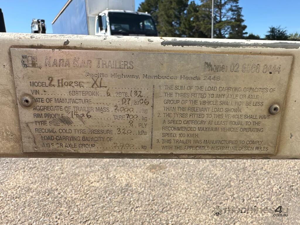 CP: 07/2006,Kara Kar,2 Horse XL,Dual Axle Horse Float,Hubometer not visible,Colour: White,Unregistered,VIN: 6B9TEPDKK62BT8182,Sold with No Plates,Key No: NO KEYS