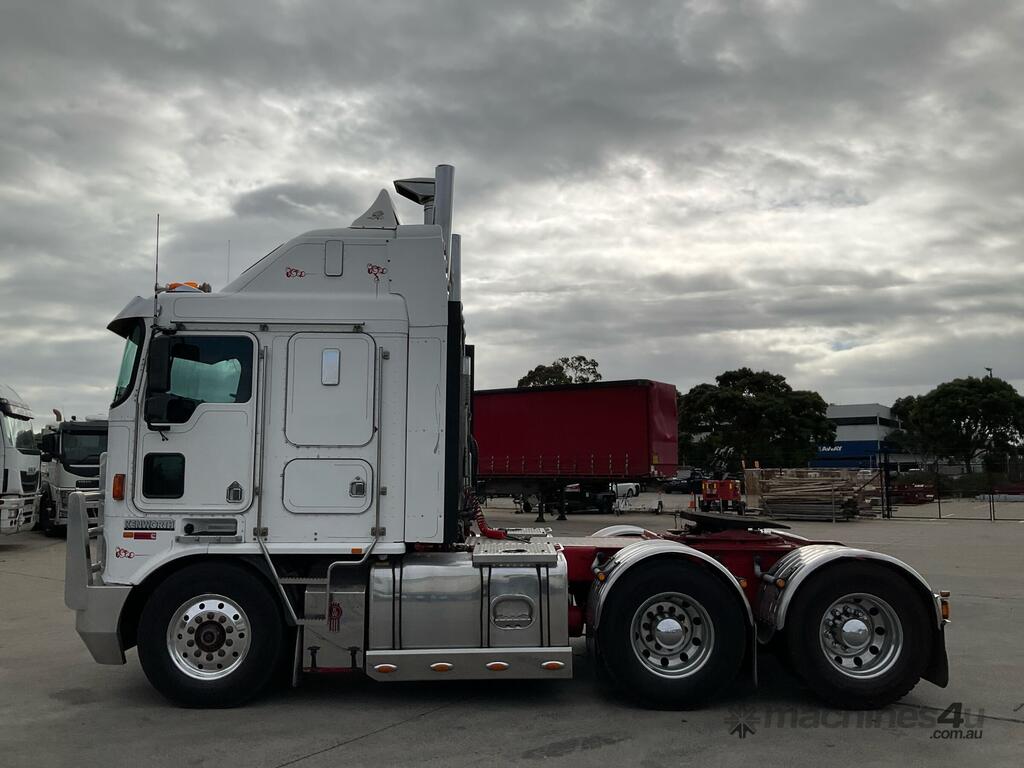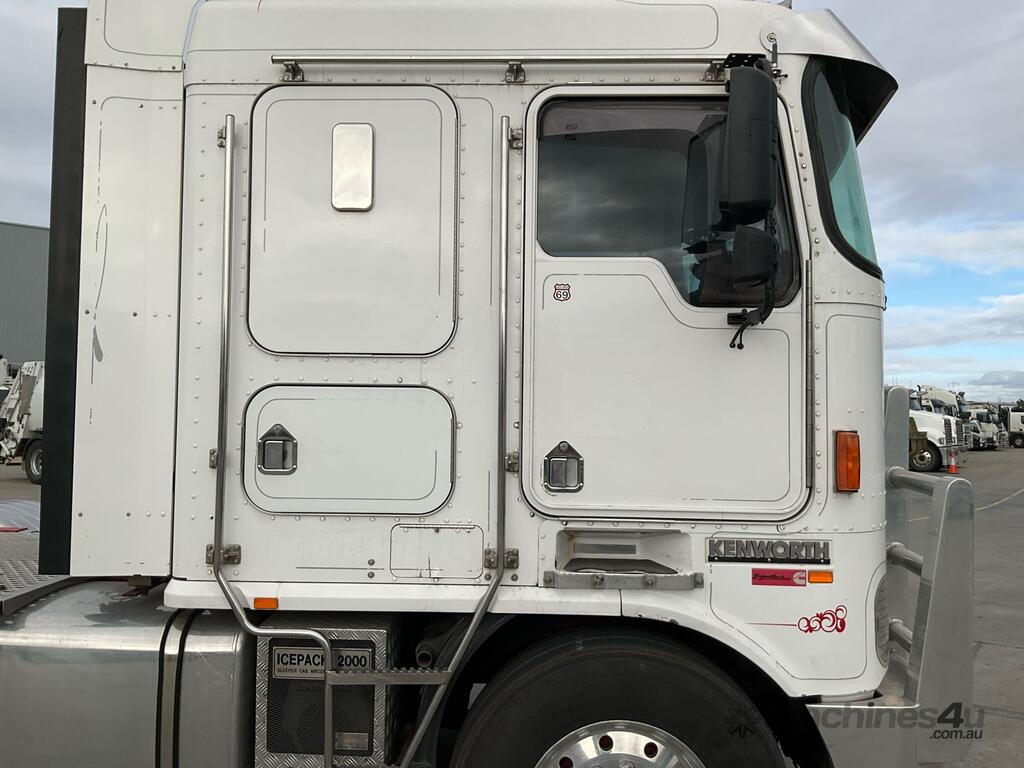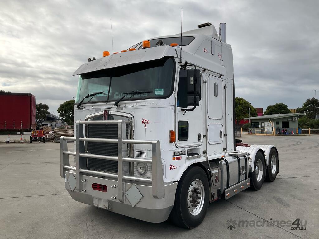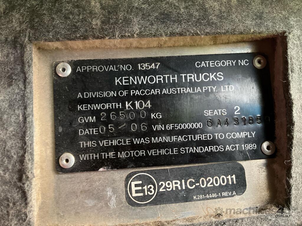 CP: 05/2006,Kenworth,K104,Prime Mover,Manual,Air Bag Suspension,Engine #: 79170595,Cummins Signature,6 Cyl,Diesel,18 Gears,112122 (Kms. Showing on Odometer),Hourmeter not visible,Colour: White,Rego. No: BJH620,VIN: 6F50000006A431859,Key No: 44,GVM: 26500,GCM: 90000,Sold with No Plates,Key No: 44
