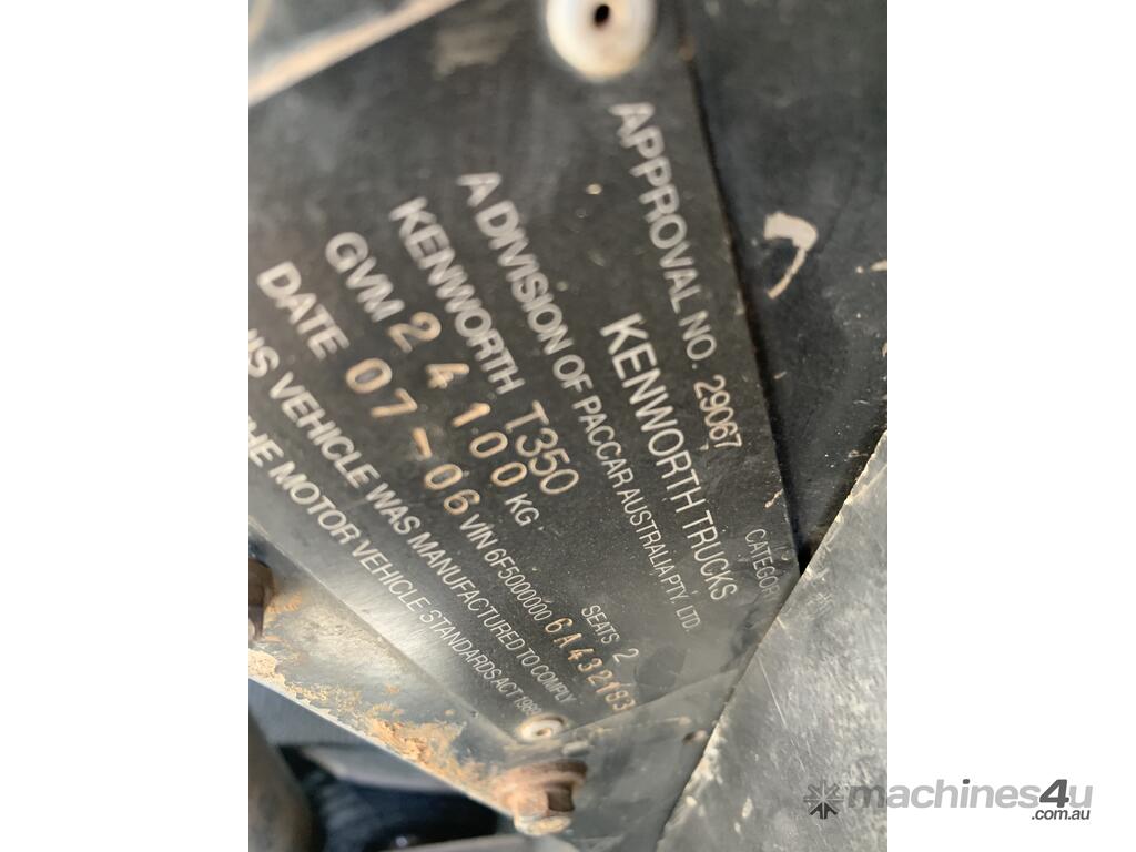 CP: 07/2006,Kenworth,T350,Service Body,6 Cyl,Diesel,Intercooler Turbo,374270 (Kms. Showing on Odometer),16237 (Hrs. Showing on Hour meter),Colour: White,Rego. No: NP(994VFL), Unregistered QLD,VIN: 6F50000006A432183,GVM: 24100,Sold with No Plates
