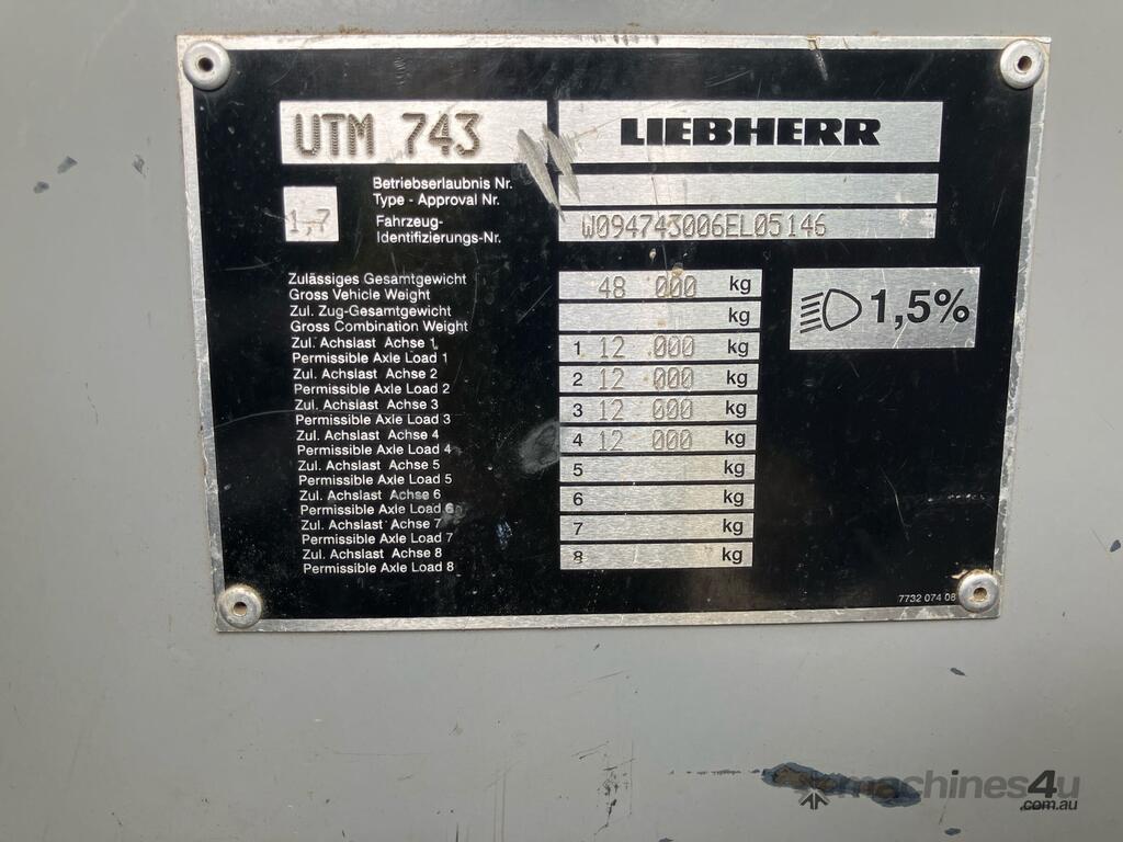 CP: CIRCA 2006,Liebherr,LTM 1090-4.1,All Terrain Crane,6 Cyl,Diesel,213715 (Kms. Showing on Odometer),0 (undefined),Colour: Yellow,Unregistered,VIN: WEL05146,Sold with No Plates