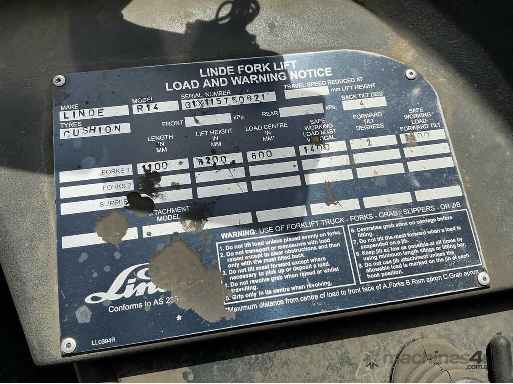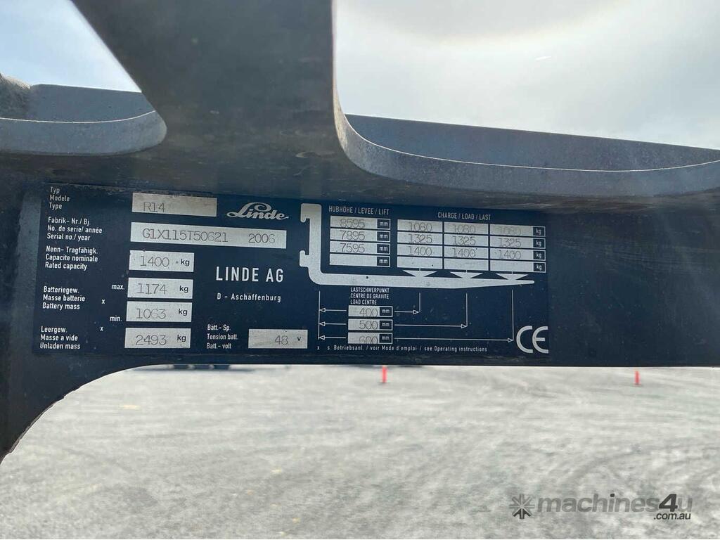CP: CIRCA 2006,Linde,R14,High Reach Forklift,Electric,Odometer not visible,Hourmeter not visible,Colour: Red,Unregistered NSW,Serial No: G1X115T50621,Sold with No Plates,Key No: NO KEY