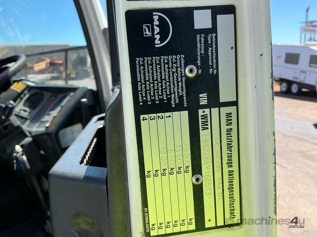 CP: 04/2006,MAN,LE 15.280,Vacuum Truck,Manual,8 Bag,6 Cyl,Diesel Turbo,8 Gears,543414 (Kms. Showing on Odometer),112 (Hrs. Showing on Hour meter),Colour: White,Rego. No: 1CMV026 WA,Rego expiry: 31/01/2027,VIN: WMAL84ZZ66Y160573,Key No: 576,Length: 8.5 m,GVM: 15000,Plates to All,Key No: 576