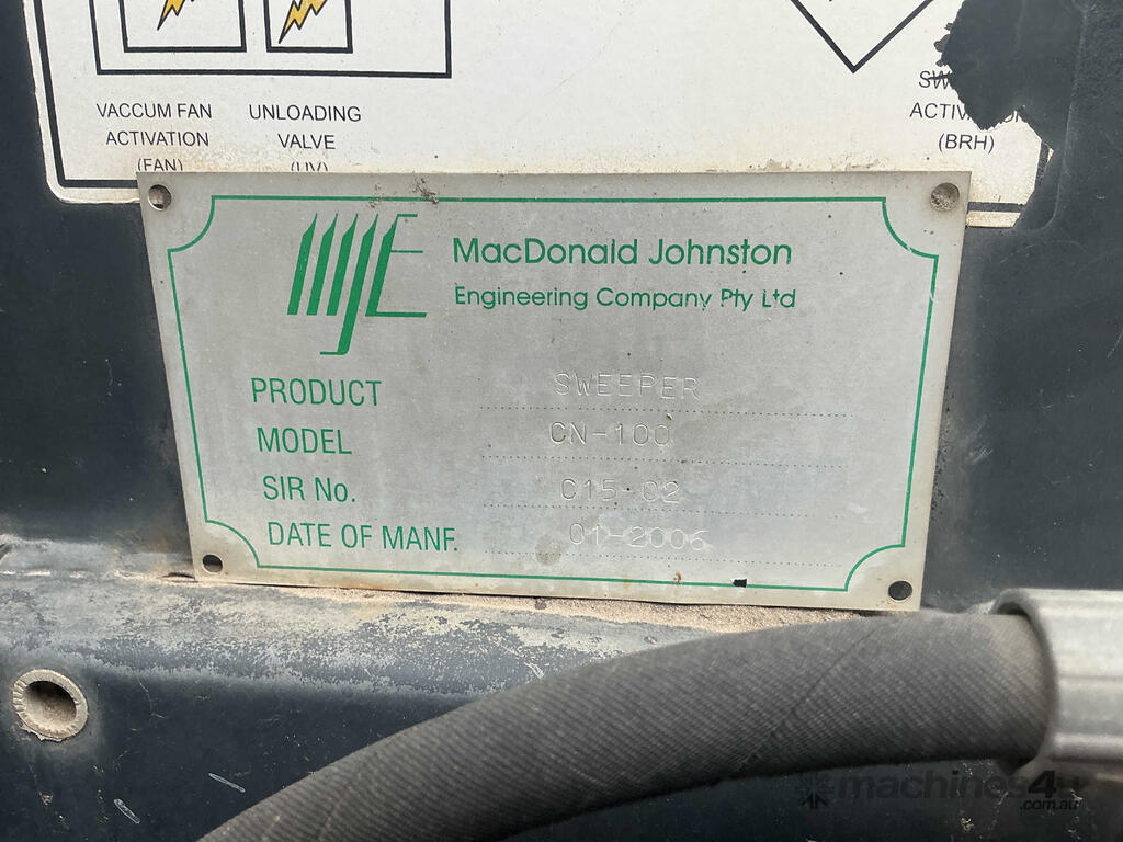 CP: 01/2006,MacDonald Johnston,CN100,Street Sweeper,Diesel,Odometer not visible,1773 (Hrs. Showing on Hour meter),Colour: White,Unregistered,Serial No: C1502,Sold with No Plates,WOVR Status: WOVR N/A,Incident Type: Impact