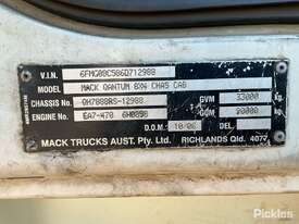 CP: 10/2006,Mack,Quantum,Vacuum Truck,Manual,Air,6 Cyl,Diesel Turbo,53671 (Kms. Showing on Odometer),2591 (Hrs. Showing on Hour meter),Colour: White,Rego. No: 1CNY317 WA,VIN: 6MFG08C586D712988,Key No: 578,Length: 10000 undefined,GVM: 33000,GCM: 90000,Sold with No Plates,Key No: 578