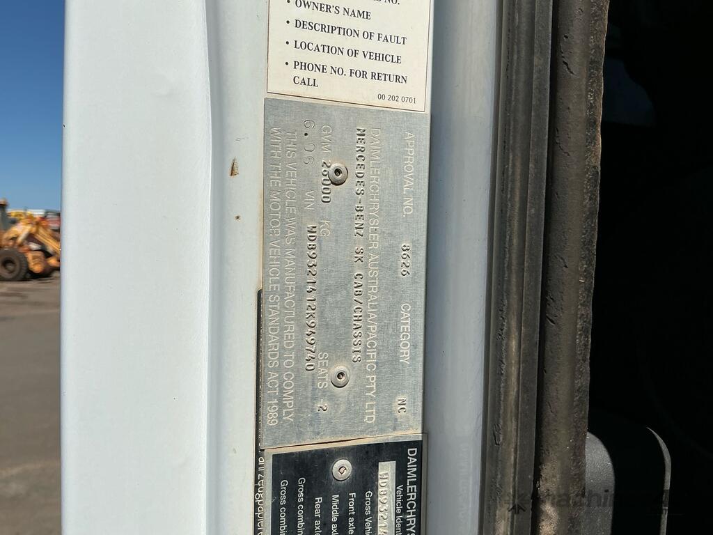 CP: 06/2006,Mercedes Benz,Actros 2632,Crane Borer,Automatic,Trunnion,6 Cyl,Diesel Turbo,204318 (Kms. Showing on Odometer),9697 (Hrs. Showing on Hour meter),Colour: White,Rego. No: 1HMZ937 WA,VIN: WDB9321412K949740,Key No: 33,Length: 9.7 m,GVM: 26000,GCM: 55000,Sold with No Plates,Key No: 33