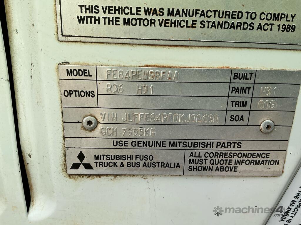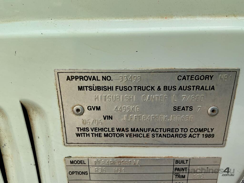CP: 06/2006,Mitsubishi,Canter 3.5,Crew Cab Table Top,Manual,Leafspring,4D34,3.9 Ltr,4 Cyl,Diesel Turbo,5 Gears,98684 (Kms. Showing on Odometer),3850 (Hrs. Showing on Hour meter),Colour: White,Rego. No: 1CHV564 WA,VIN: JLFFE84PE0KJ00630,Key No: 380,Length: 6.2 m,GVM: 4495,GCM: 7995,Sold with No Plates,Key No: 380