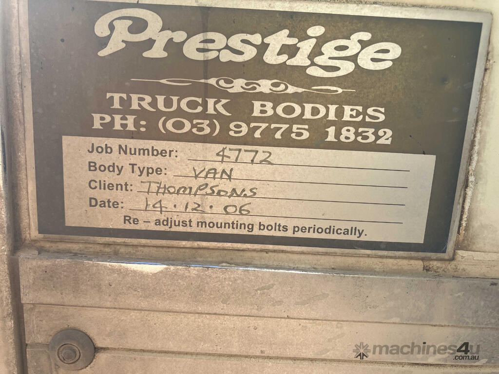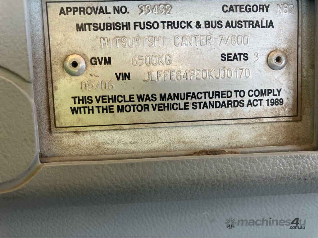 CP: 05/2006,Built: 05/2006,Mitsubishi Fuso,Canter 4.0T,Pantech Body,Manual,Leaf Spring Suspension,Engine #: 4D34K38548,diesel,4 Cyl,Diesel Turbo,Direct & Multi-Point Injection,5 Gears,386043 (Kms. Showing on Odometer),Hourmeter not visible,Colour: White,Rego. No: NP(UHO747), Unregistered VIC,VIN: JLFFE84PE0KJ00170,Chassis: JLFFE84PE0KJ00170,Key No: 09,Length: 6.5 m,GVM: 6500,GCM: 10000,Sold with No Plates,Key No: 09