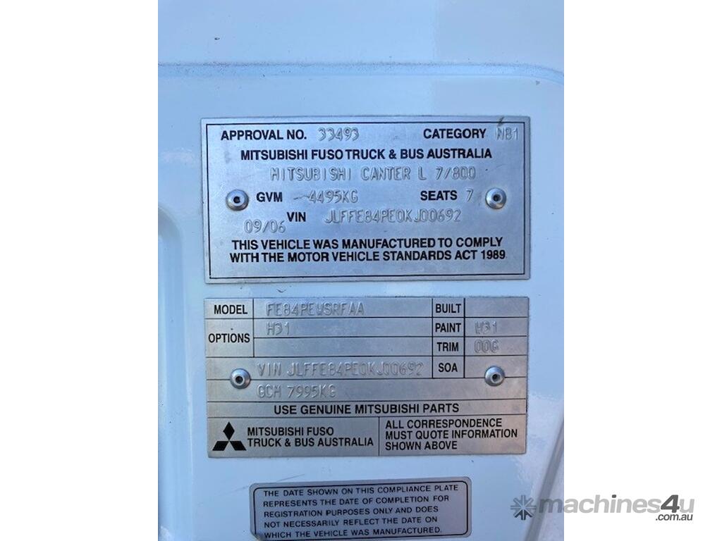 CP: 09/2006,Mitsubishi Fuso,Canter 7/800,Dual Cab Truck,Manual,4 Cyl,Diesel,384312 (Kms. Showing on Odometer),Hourmeter not visible,Rego. No: NP(WDJ924), Unregistered VIC,VIN: JLFFE84PE0KJ00692,Length: 6.5 m,Sold with No Plates,WOVR Status: WOVR N/A,Incident Type: Impact
