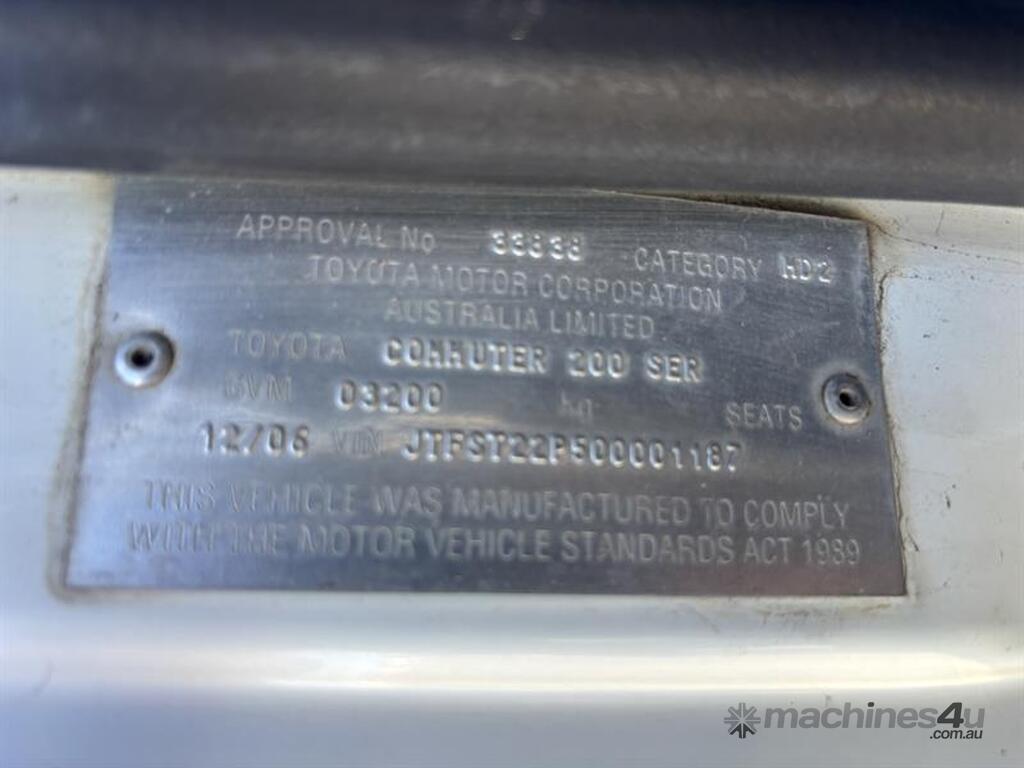 2006 TOYOTA COMMUTER BUS, VIN: JTFST22P, E/N: 1KD1559341, 428,299KM SHOWING, REGISTRATION EXPIRES 31/05/2026, COI EXPIRES 01/08/2026. LOCATION: HALFERTY STREET, EMERALD, QLD 4720. INSPECTIONS & COLLECTIONS: MONDAY TO FRIDAY, 8AM TO 4PM. ENQUIRIES: JOHN MCDOUGALL ON OR JOHNEMERALDAUCTIONCENTRE