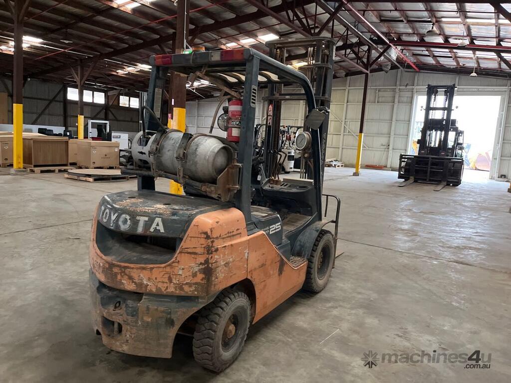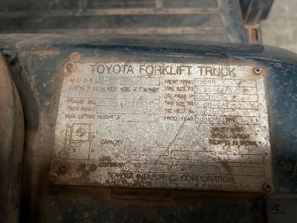 CP: CIRCA 2006,Toyota,32-8FG25,Forklift,4 Cyl,Petrol or LPG (Dual),Odometer not visible,5012 (Hrs. Showing on Hour meter),Colour: Yellow,Rego. No: NP(UQJ147), Unregistered VIC,Serial No: 308FG25-10334,Sold with No Plates,Key No: A51