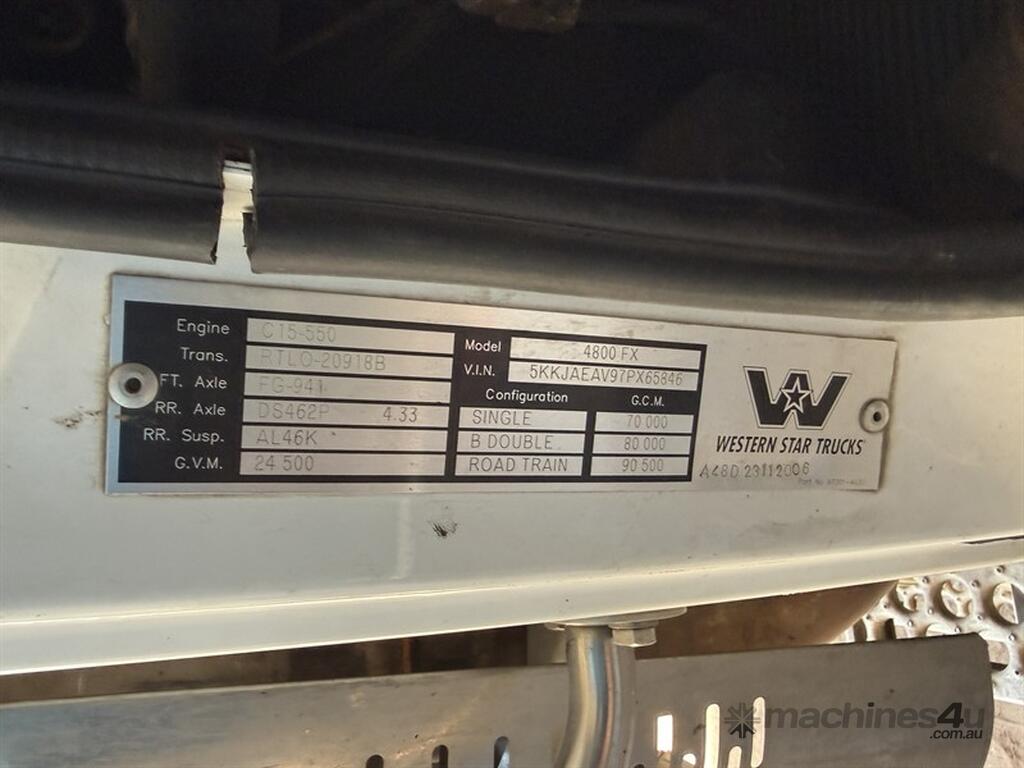 2006 Western Star 4800 FX Prime Mover. Constellation Series, ODO reads 260,410kms, motor C15-550, tare 9180kg, GVM 24500kg. Was having some minor work done when photos were taken. It working condition. Located in Narrabri NSW. Call Sandy Cosh on to organise inspection.
