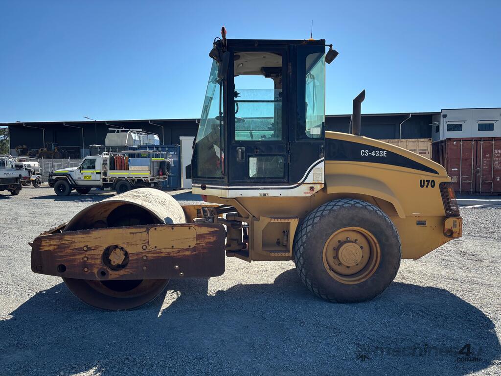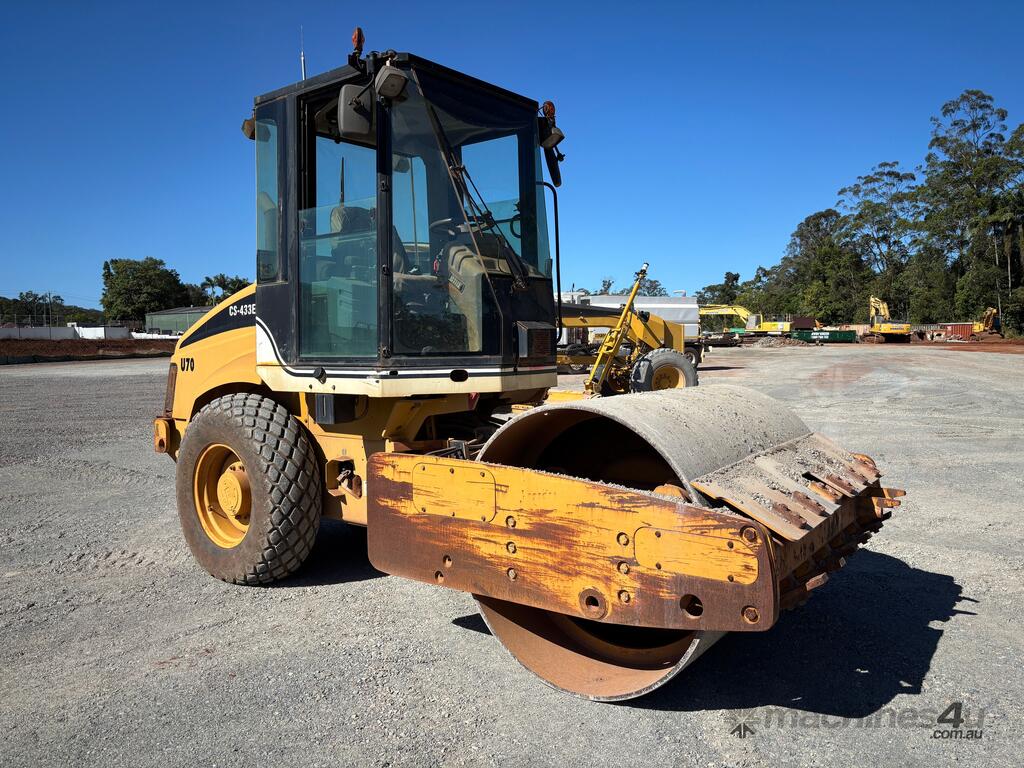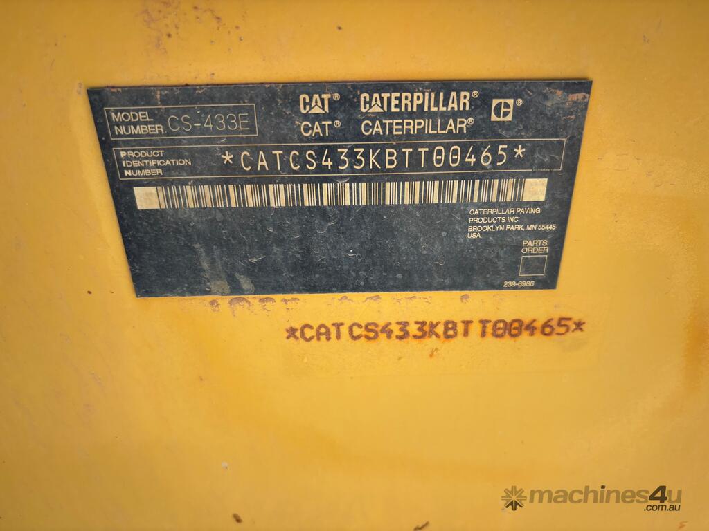 CP: CIRCA 2007,Caterpillar,CS-433E,Smooth Drum Roller,Engine #: CRS43590,4 Cyl,Diesel,Odometer not visible,2074 (Hrs. Showing on Hour meter),Colour: Yellow,Unregistered,VIN: CATCS433KBTT00465,Serial No: BTT00465,Sold with No Plates