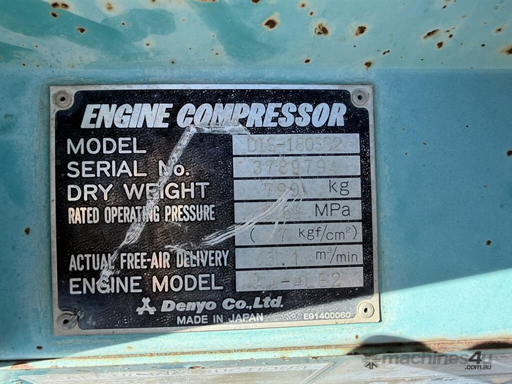 2007 DENYO DIS-180SB COMPRESSOR - 2007 build, 4,004 hours, 185CFM, tyres good, no hose or wand included, working condition, selling due to upgrade. SN - 3789794. Located Pallamallawa NSW. Contact Sandy Bailey for more information.